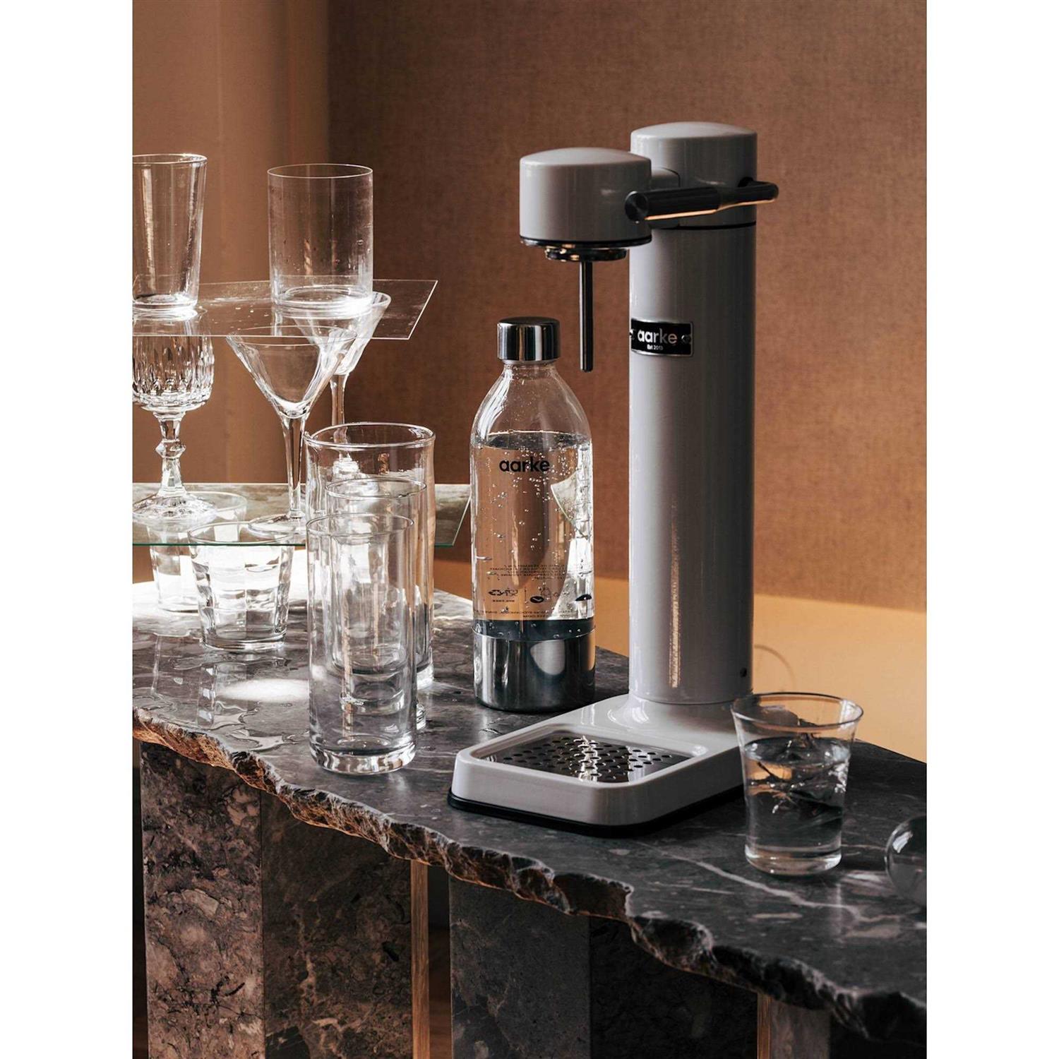 Compact minimalism Making sparkling water at home has never been so elegant. The Aarke Carbonator 3 was designed from the inside out to be the slimmest and most compact sparkling water maker. Quality conscious design Forget the plastic sparklers of the past – when it comes to performance, environmental sustainability and durability, it can’t be beat. The Carbonator 3 is constructed with a seamless body that fulfills both form and function as the backbone of the machine. The precision nozzle The most striking feature of the Carbonator 3 is the designed precision nozzle, which is CNC machined from a single piece of stainless steel. The result is a beautifully polished nozzle that produces a smooth, controlled spray. Updated, damping-controlled lever and end cap. The movement of the lever is regulated by a rotational damper that allows for a more controlled release of pressure in the bottle. The damper also allows for a higher fill line on the bottle without causing performance issues. The end cap of the lever is finished with an eye-catching spinning finish. Bottle Design The iconic Aarke bottle is now slimmer than ever with a completely refined shape. The bottom piece of the bottle is also engineered and features a screw mechanism for increased durability. The ability to separate the metal and plastic components also makes it possible to recycle the bottle at the end of its life. The PET bottle is still BPA-free and non-toxic, and is suitable for use on the countertop, on the dining table, and in a tote bag for travel. Updated packaging A graphic design for the machine and PET bottle packaging makes the products stand out even more. The machine packaging now also comes with a cleaning cloth to keep your kitchen utensil spotless.