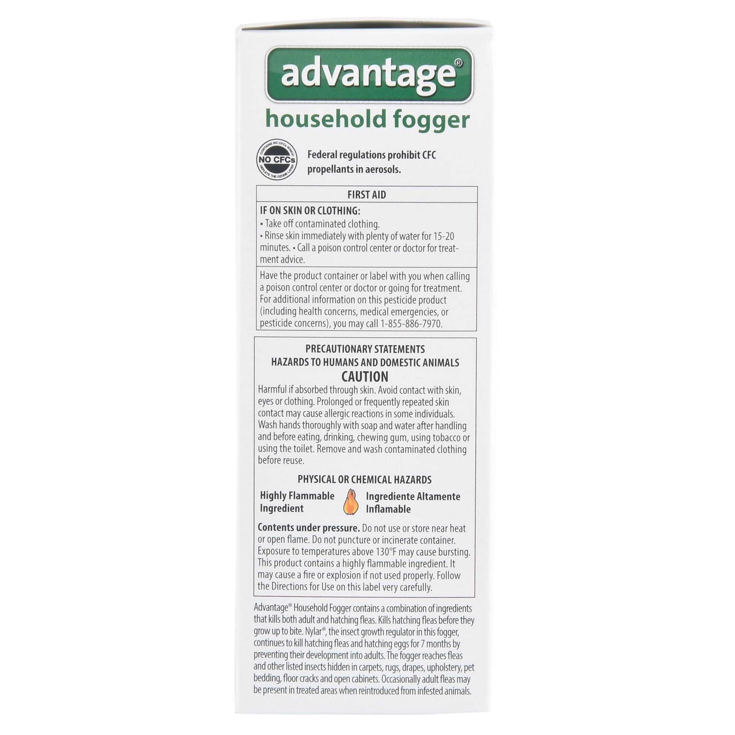 Help protect your home and family from parasitic pests with the Advantage Household Fogger. Scientifically formulated with a highly-effective combination of ingredients, this EPA-registered fogger works to kill fleas, flea eggs, flea larvae and ticks, as well as cockroaches, lice, mites, bedbugs, ants and many other household pests. Part of a complete flea control program that includes treating your pet and yard with appropriate products, this easy-to-use, this three-pack of foggers helps protect your home for up to seven months. Key Benefits Scientifically formulated with a highly-effective combination of ingredients to help eliminate parasitic pests in your home. EPA-registered fogger works to kill fleas, flea eggs, flea larvae, ticks, cockroaches, lice, mites, bedbugs, ants and many other household pests. Each can treats an 8-foot-ceiling room measuring up to 16 x 16 feet, or 2,000 cubic feet of unobstructed space. Continues working for up to seven months to effectively break the pest life-cycle and protect your home from re-infestation. An important part of a comprehensive prevention program that includes treating your pet and yard with appropriate products to ensure complete control.