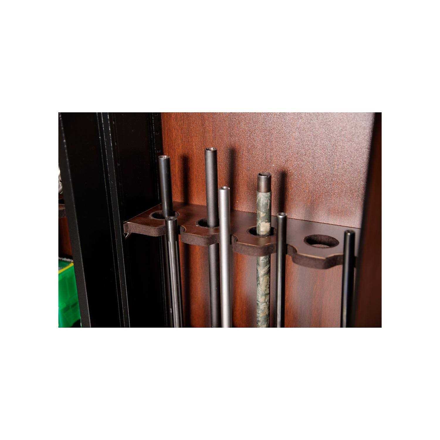 Its classic design includes a scratch-resistant textured black finish with gold rim. The cabinet interior and door back are fitted with wood grain paneling accents for added style. Each metal gun cabinet is equipped with a heavy-duty three-bolt locking mechanism and two keys for added security. The large door handle and key slot on the American Furniture Classics Wood mark Series 16-Gun Cabinet are coated with a polished brass finish that gives a rich look to this Wood mark Series 16 Gun Cabinet. The smaller side can be used with either shelving or an additional butt plate and barrel rest for maximum gun storage capacity. The American Furniture classics gun cabinet can be secured to the wall or the floor easily. Holds long guns and shotguns.