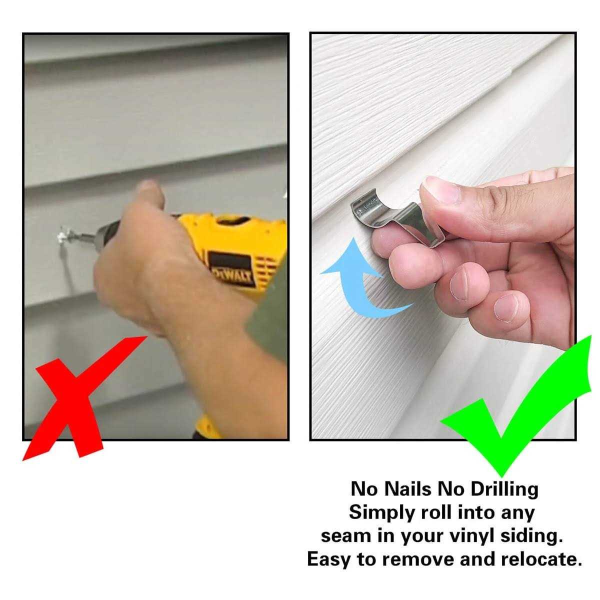 • 【NO HOLES OR TOOLS REQUIRED 】Simply roll into any seam in your vinyl siding. No screws, No drilling.