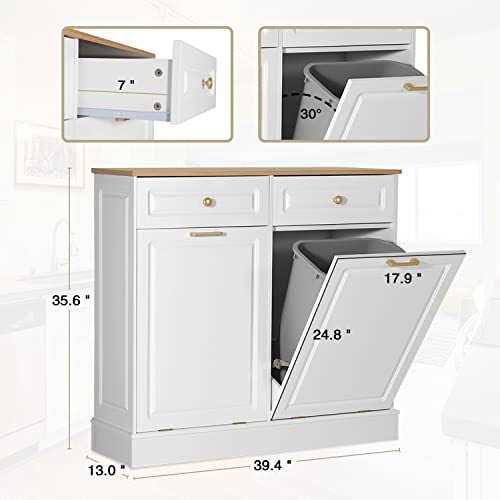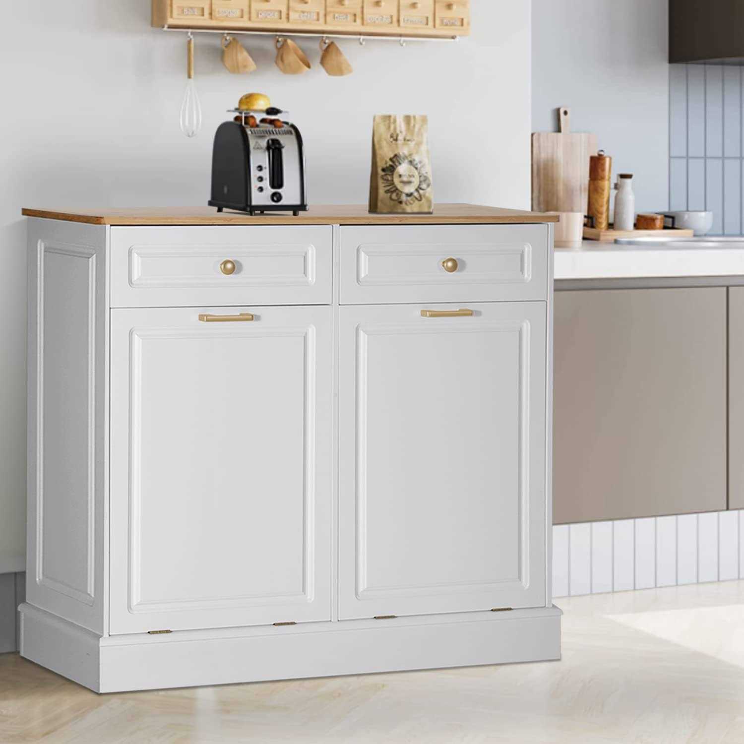 Anbuy Double Kitchen Trash Cabinets Dual Tilt Out Trash Cabinet with Two Wood Hideaway Trash Holder Drawers, Free Standing Recycling Cabinet Trash Can
