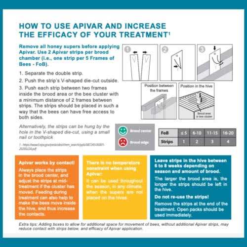 Amitraz, an acaricide, is the active ingredient in Apivar strips. – Apivar is packaged in vacuum-sealed foil pouches. As bees walk on the strip’s surface they pick up molecules of the active ingredient and then distribute them throughout the colony. Apivar has been subject to a variety of stringent regulatory studies and evaluations and its high effectiveness was proven by various scientific trials in different countries, with a constant efficacy between 97 and 99% for more than 10 years. *Directions for using Apivar:See the Apivar Instruction Sheet in the product images1. Remove honey supers before application of Apivar.2. Use 2 Apivar strips per brood chamber (i.e., one strip per 5 Frames of Bees – FoB).3. Separate the double strip and hang each strip between two comb frames inside the brood area or the bee cluster, with a minimum distance
