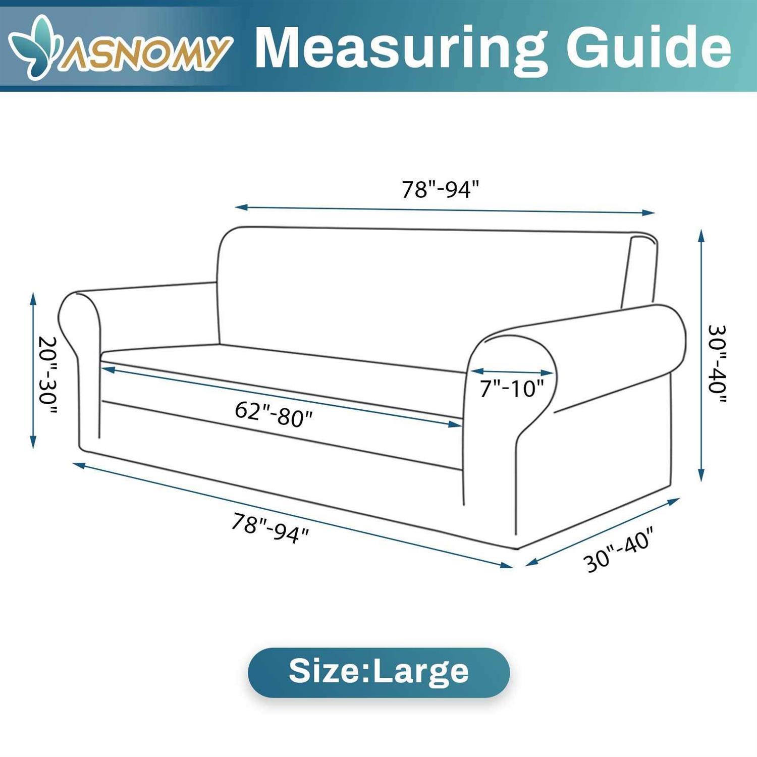 【High Quality Fabric】: 94% polyester 6% spandex, Soft skin-feel Jacquard material,comfortable and anti-wrinkle. Asnomy sofa slipcover protector fit for most types of couches. 【Fabulous Protective Cover】:give your old, damaged or ugly sofa a new look,feel smooth, durable.protect your sofa from scratches, leaks and accidents.beautiful and save you money by extending the life of your couch. 【Measure Size】:Large size of slipcover is fit for the sofa with total length between 78″-94″ including armrests, while the sitting area length is between 62″- 80″. Please check the measurement guide in the picture before purchasing. 【Easy Care & Installation 】: Asnomy have various colors sofa cover to choose.WASHING TIPS: Machine washable(cold), gentle cycle, tumble dry low.