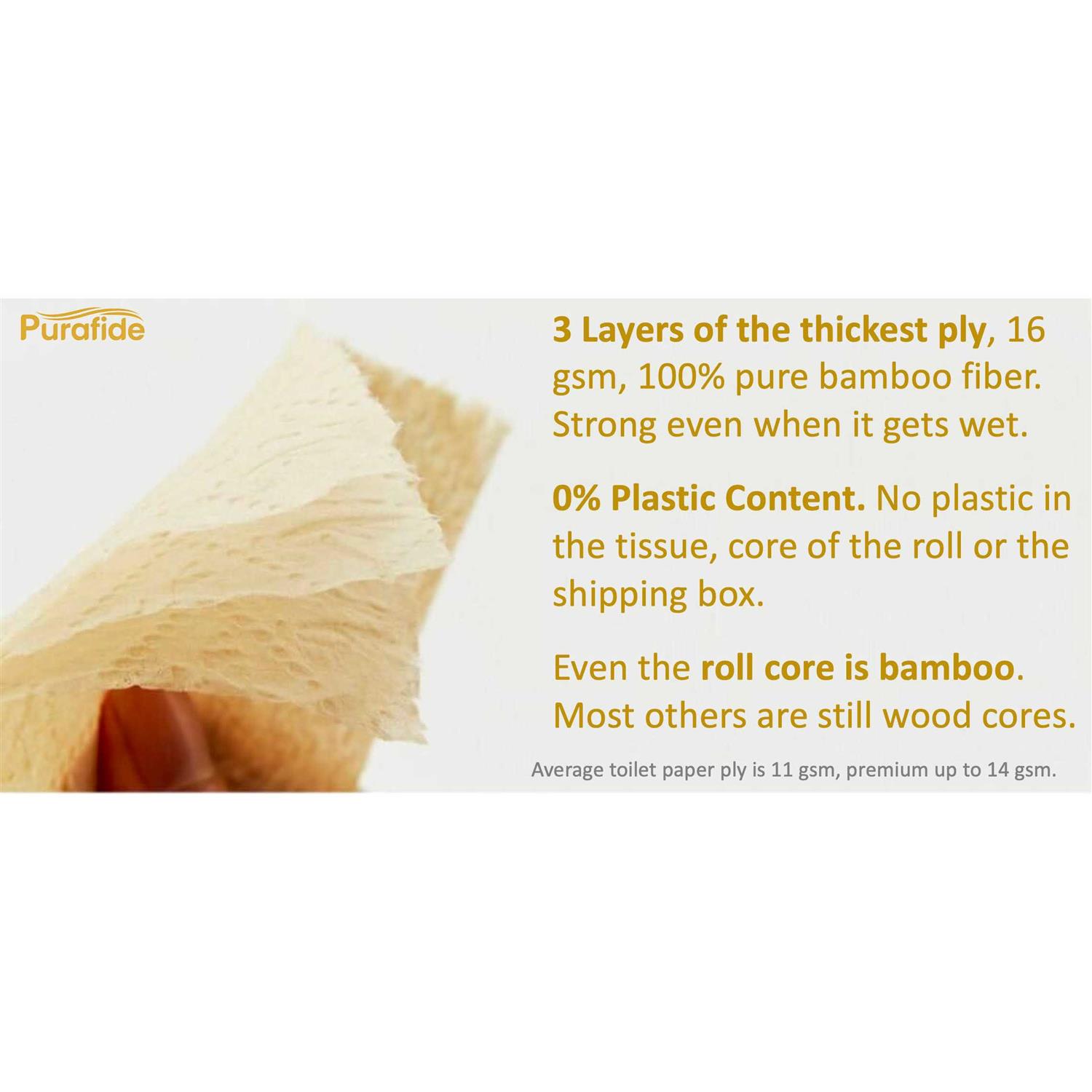 100% Pure, All-Natural, Tree-Free, Ultra-Soft, Super Absorbent Bamboo pulp paper. Ultra-Soft, Naturally hypo-allergenic, comfortable for sensitive skin, septic safe. Helps prevent the spread of germs. Bamboo contains a natural antimicrobial agent called bamboo-kun. This makes bamboo toilet paper naturally resistant to bacteria and other microbes. No toxic chemicals used to soften or whiten the paper. No bleach, no cholerine, no dyes, no inks, no formaldehydes. 3 extra thick layers of tissue per sheet. Our tissue is 16 gsm per ply. Ultra-soft tissue with an embossed print for more comfort. Stronger and more absorbent than the typical toilet paper. Bamboo is a grass 10x stronger than wood fibers (typical tissue paper) that is eco-friendly, sustainable resource.