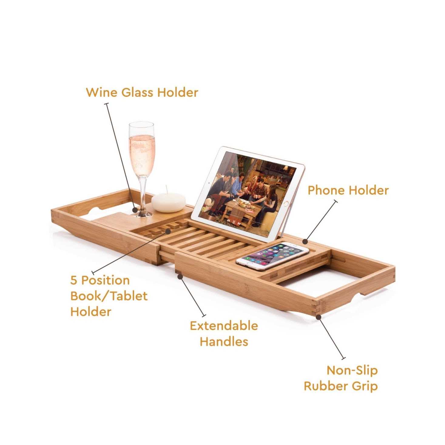 Bambusi Bathtub Caddy with Extendable Sides, Wine Glass Holder, Book Stand and Phone Tray