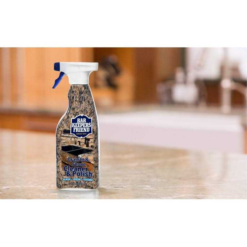 Stone Surface Polish & Cleaners by Bar Keepers Friend. Details:Bar Keepers Friend Granite & Stone Cleaner & Polish is a pH-balanced cleaner for natural and manufactured stone countertops and other stone surfaces. Our granite cleaner contains no harsh chemicals, abrasives, or acids, so it cleans granite, silestone, quartz, and other polished stone without marring the finish or dulling the shine. Use BKF’s granite and stone cleaner in the kitchen, the bathroom, or on polished stone items outdoors. Clean and polish without scrubbing. Just spray the cleaner across the surface, and wipe away in a circular motion, using a soft cloth, microfiber towel, or paper towel. For heavily soiled surfaces, apply cleaner and let stand about one minute. Use a non-abrasive nylon-mesh sponge or microfiber towel to rub the surface before wiping the granite countertop cleaner away.