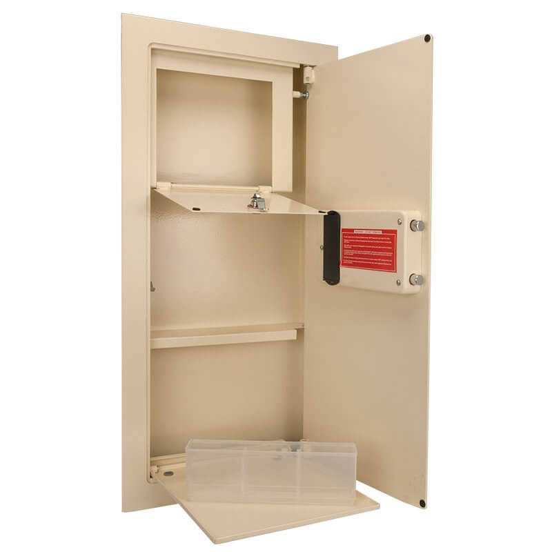 The Wall Safe & Hotel Safe model AX12880 by Barska. Large Biometric Wall Safe, left opening, biometric fingerprint scanner, interior locking compartment, interior LED light, fold out tray, removable shelf, backup external battery pack, 2 solid steel locking bolts, front access, steel construction, includes (6) AA batteries, 2 exterior keys, 2 interior keys, Allen Wrench, mounting screws, internal floor mats, and plastic separator, cream colored, 0.82 cu ft, 31.5H x 15.5W x 4D ( Barska – AX12880 ) The AX12880 Wall Safe & Hotel Safe for your restaurant equipment needs.