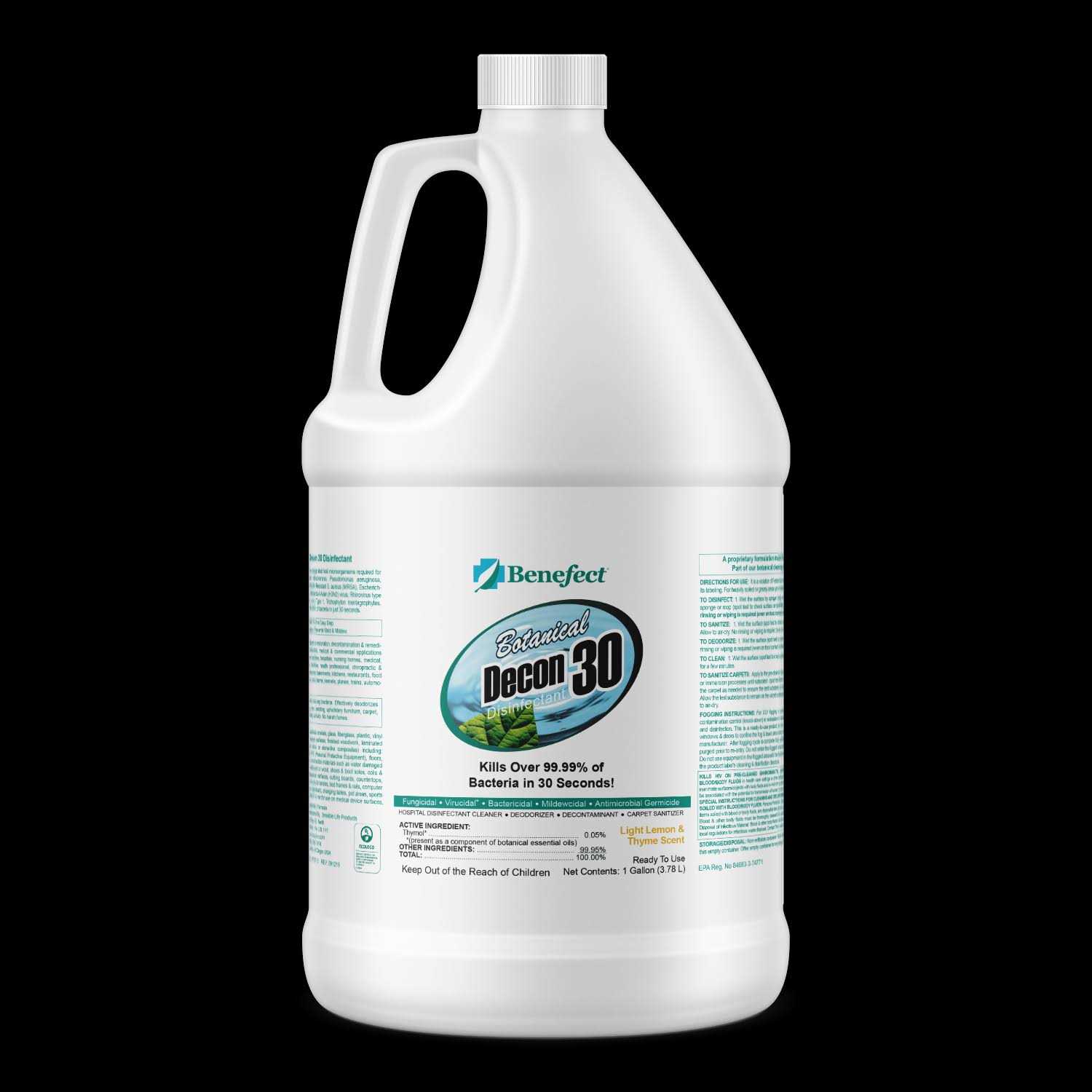 Protect those who need it the most with Benefect Botanical Decon 30 Disinfectant. From pipes bursting to dishwashers leaking, many water loss jobs happen in the kitchen. As a Food Contact Surface Disinfectant, Botanical Decon 30 can decontaminate sensitive kitchen surfaces without rinsing, wiping, or leaving behind synthetic chemical residues. Typical disinfectants require rinsing or wiping after 10 minutes of contact time. Decon 30 effectively kills over 99.99% of viruses, bacteria, and mold by simply applying and air drying. It is bactericidal against Staphylococcus aureus (Staph), Salmonella enterica, Pseudomonas aeruginosa and Escherichia coli (E-coli) and virucidal against Rhinovirus (the common cold virus) and Influenza A including H1N1 on hard, non-porous, inanimate surfaces. It’s also effective on semi-porous walls, wood framing, concrete, and carpet – eliminating odors produced by fungi, bacteria and more. Packaged in a 1-gallon bottle four pack. No mixing or diluting required.Benefect, a certified B Corp., is a world-recognized leader in next-generation botanical antimicrobial technology. The active ingredient in our disinfectants is highly specialized thyme oil that has been grown and blended to exacting specifications. Our full line of disinfectants and cleaning products is formulated for the professional restoration contractor.