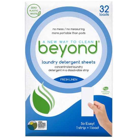 More portable than pods, Beyond Laundry Detergent Sheets are convenient, dissolvable strips of laundry detergent that require no measuring. Lighter than liquid with less packaging, these perforated laundry detergent sheets are great for those who live in apartments or dorms, use shared laundry spaces, travel often, or need to hand wash certain clothing items. So easy! One strip = One load. 32 strips per package. Help our Earth and make laundry a breeze!