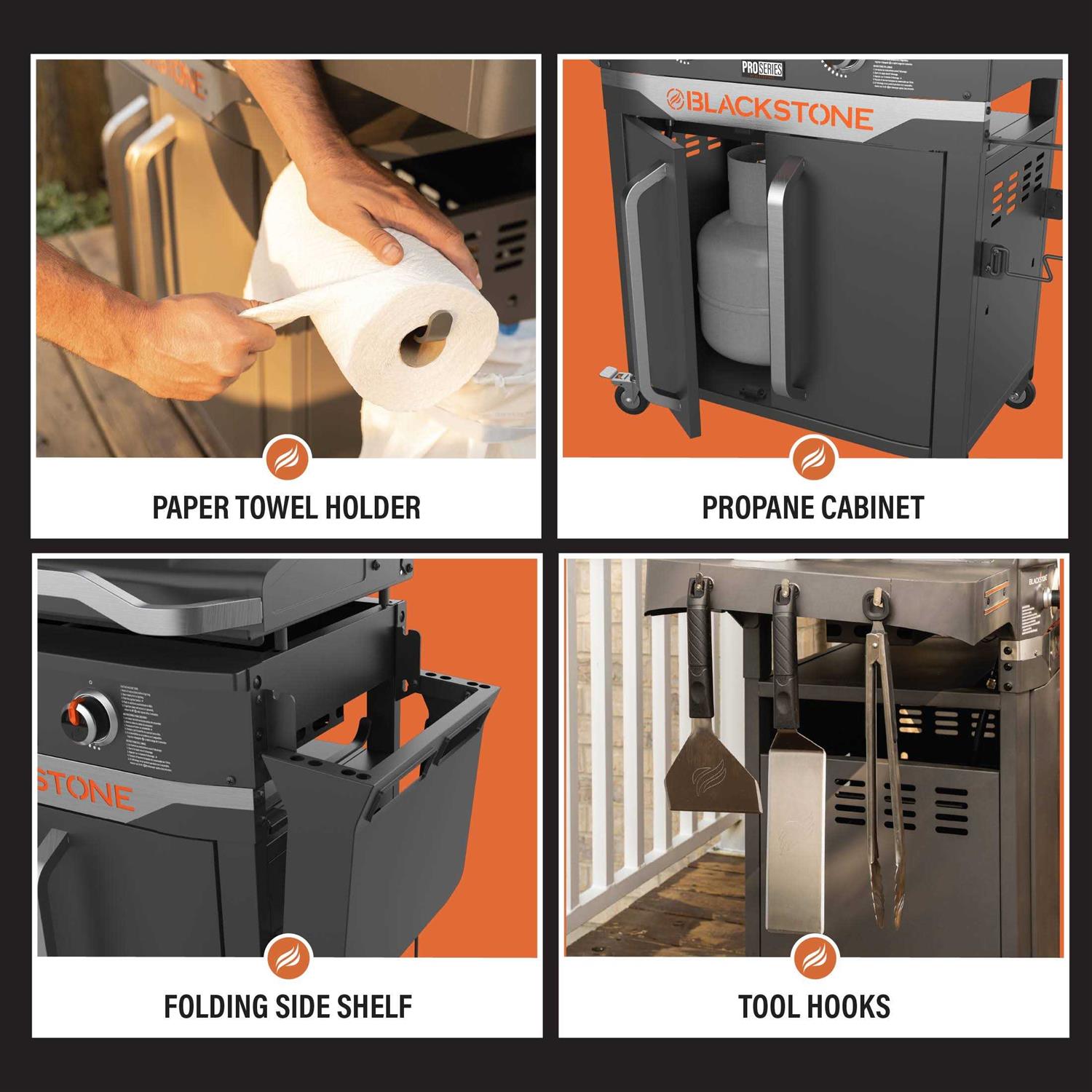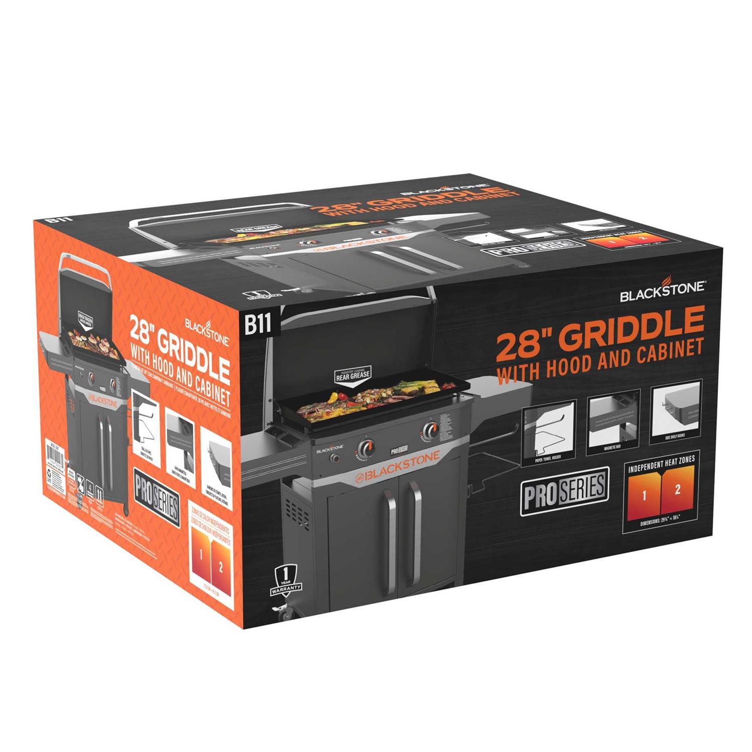 Griddle up a feast like a pro with the Blackstone ProSeries 2 Burner 28 inch Propane Griddle with Cabinet and Hood. Built-in hood for steaming, smoking, and cleanliness. Have everything you need at a single cooking station to save trips back inside or to the car. Hang your grilling tools on one side shelf with hooks and a magnetic bar, while using the opposite side to hold paper towels and a waste bag. Store a gas tank and other safe items under the griddle in an enclosed area. Pair this griddle with other pieces from the Blackstone ProSeries collection or any professional Blackstone griddling tools to enhance your griddling experience.