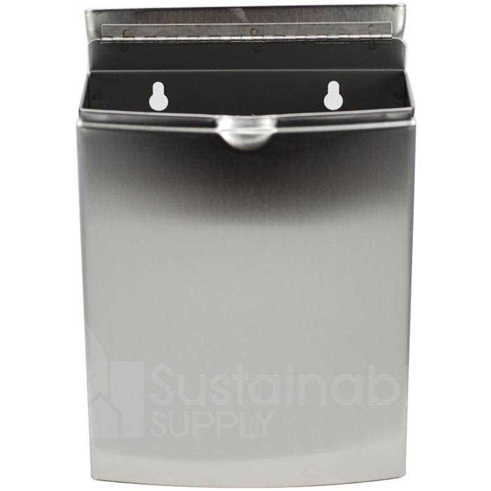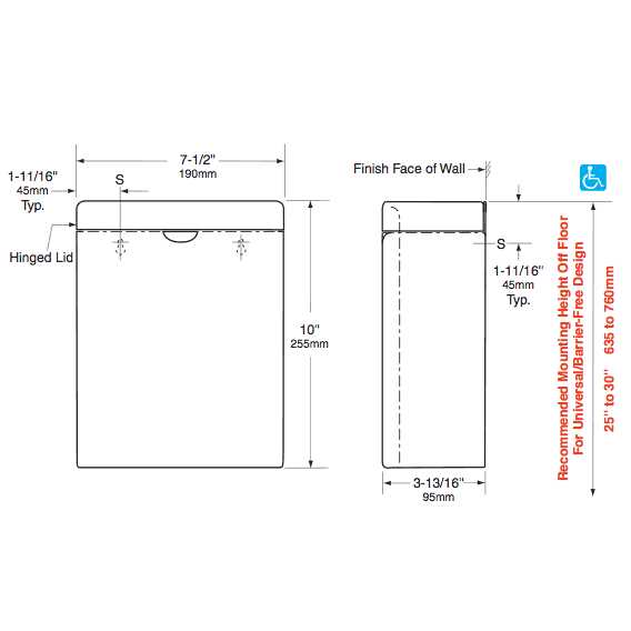 Match your other Bobrick ConturaSeries washroom accessories with this surface mounted, top-loading sanitary napkin disposal container. The Bobrick Model B-270 is constructed of 22-gauge, type-304 stainless steel with a sleek satin finish. In the unit, a one-piece, drawn cover is equipped with a full-length stainless steel piano hinge. The front of the receptacle has the traditional Bobrick ConturaSeries degree of arc and style. The radius on the side edges of the container also match the corners and edges of the cover and the other ConturaSeries accessories. The unit has an integral finger depression for opening the cover and its capacity is 1.2 gallons. The unit is easy to use, and servicing the unit can be simply achieved via the flip-up cover. With a height of 10 inches and width of 7-1/2 inches, this unit extends only 3 -13/16 inches from the mounting surface.
