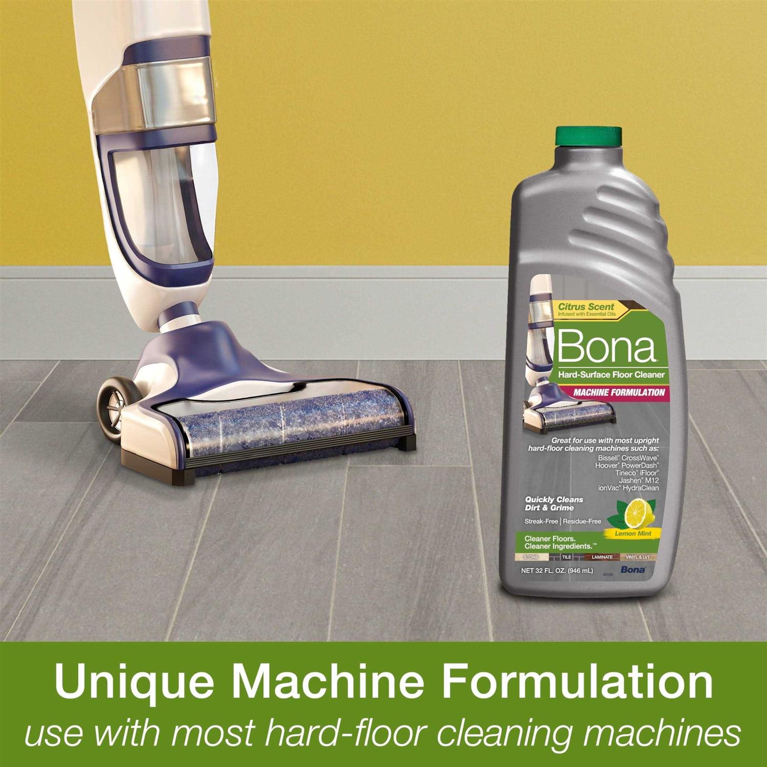 Bona Hard-Surface Floor Cleaner is now available in a specially formulated solution designed for use with most upright hard-floor cleaning machines. This unique formula is crafted to work effectively with your machine to quickly clean dirt and grime, leaving your floors clean and beautiful. Water based solutions and Safer Choice certification ensure a safer product for your family, pets and our planet. Featuring an essential oil infused Lemon Mint scent, a burst of fresh citrus verbena and Meyer lemon together with dew covered mint leaves and subtle floral aspects. Love your floors with Bona. Recommended by flooring professionals since 1919. Based on independent testing conducted by Bona. Bissell and Cross Wave are trademarks of Bissell Inc. Corporation. Hoover and Power Dash are trademarks of Techtronic Cordless GP. Tineco and floor are trademarks of Tineco Intelligent Technology Co., Ltd. Jashen is a trademark of ShenZhen Jashen Technology Co., Ltd. ionVac is a trademark of Tzumi Electronics LLC. Bona use of these trademarks does not imply any affiliation with or endorsement by the trademarks owners.