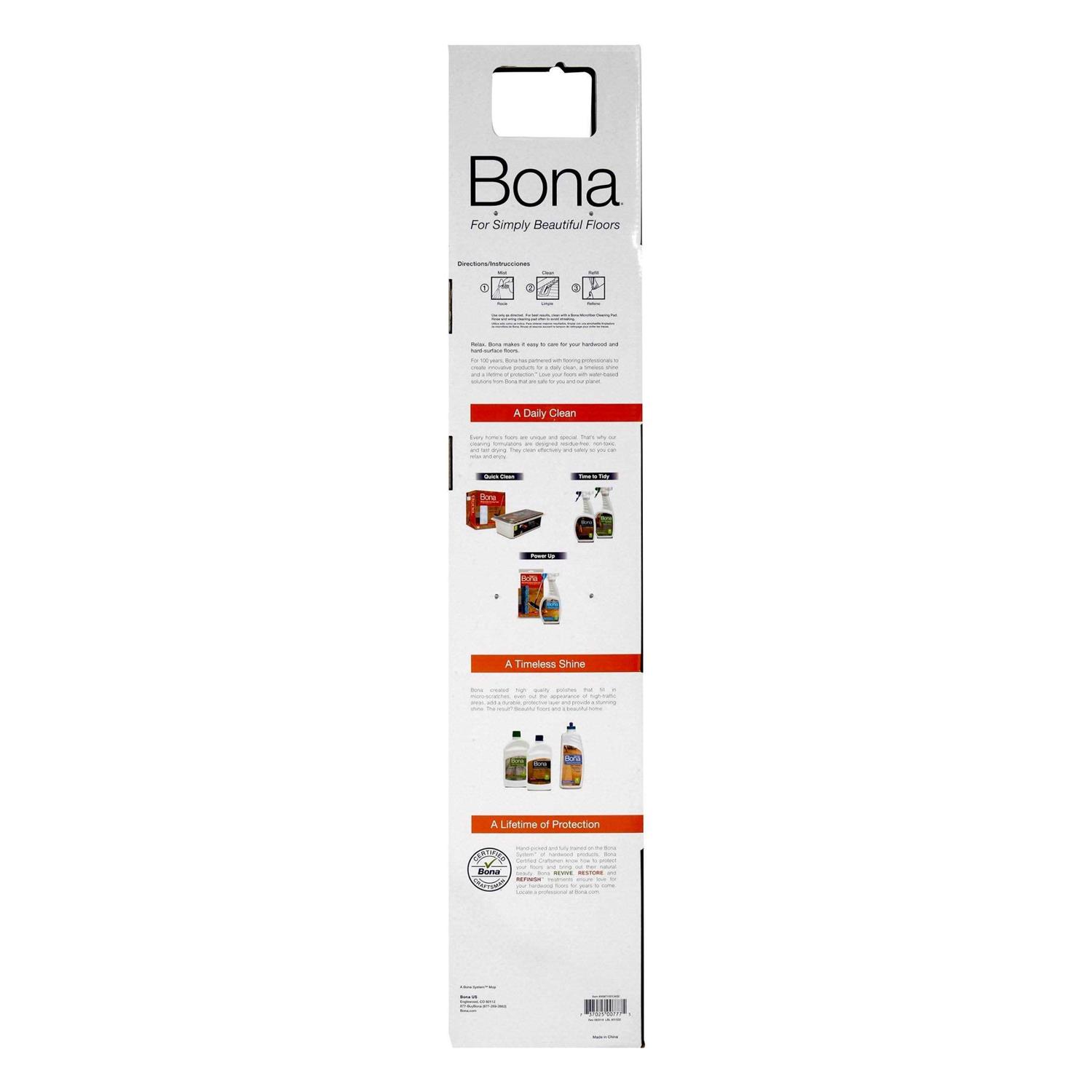 The Bona Premium Spray Mop for Hard-Surface Floors is an all-in-one solution to quickly and easily clean all your hard-surface floors like stone, tile, laminate, and vinyl. Includes Bona’s waterbased streak-free floor cleaner in a refillable cartridge and a washable microfiber pad. The rinse-free, ready to use floor cleaner cleans hard-surface floors effectively by removing dust, dirt and grime revealing beautiful floors. To refill, remove the cartridge with a push of a button. The flat bottom and wide opening allow for an easy refill and the cartridge clicks back into place. The extra-large mop head delivers quick and effective cleaning, and the flexible rubber corners protect baseboards and furniture from dings and scratches. A secondary grip provides comfort when cleaning those areas that need a little more scrubbing. The retractable hook allows for quick storage up and out of the way. Locking strips on the bottom of the mop head keep the cleaning pad attached during use. Soft microfiber won’t scratch your floor and the Bona Microfiber Cleaning Pad features a unique design with dual-zone cleaning action, the dark blue outer fibers break up grime while the inner light blue fibers trap and absorb dirt. This reusable cleaning pad can be washed up to 500 times before needing to be replaced.