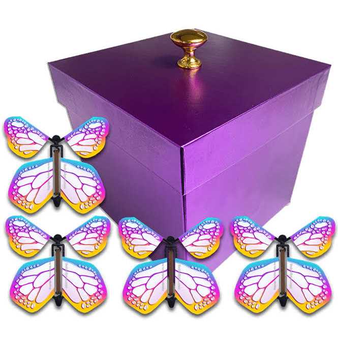 WHAT YOU GET: 1 Purple, 4 Panel, DIY Gift Box with 3 Separate Fall Down Sections on Each of the 4 Sides of the Box (See Example Photos Above) for a total of 12 fall down panels for you to decorate. BOX DOES NOT COME DECORATED! You Get 4 Famous Flying Monarch Butterflies to put inside the gift box (Choose The Color/Style Above). 1, 68 Inch Ribbon to tie around the box. The Box is a Cube that measures 5.25 inches tall x 5 inches wide. The Flying Butterflies are 4.5 inches tall x 5 inches wide. Box Designed and Crafted With Quality Materials and is Custom Made To Fit 8 of Our Famous Wind Up Flying Butterflies (Not Prewound – You Must Wind Them And Put Them In the Box). Wind Up Flying Butterflyers can be used over and over again! Flying Butterfly is not prewound. You must Wind It! Wind The Butterflyer Up About 30-35 Times and put it inside the box (See Video). No Charging or Batteries Required! A Flaw Free Guarantee (Not available On All Items). Detailed Description: Imagine the shock and surprise when someone opens Butterflyers’ Purple Exploding Butterfly Gift Box and multiple monarch wind up flying butterflies come flying out of the box! Butterflyers custom made this purple gift box to perfectly fit up to 8 of our famous wind up flying butterflies (Choose Color/Style Above). This high quality, DIY, Exploding Flying Butterfly Gift Box comes fully assembled and ready for you to decorate it! There are different colors/designs of our famous monarch flying butterfly to choose from (see options above) to put inside our explosion gift box and it’s perfect for Birthdays, Graduation, Easter, Christmas, Mother’s Day, Father’s Day, Valentines Day, Anniversaries and any other occasion you can think of. The exploding flying monarch butterfly gift box is a fabulous way to make a memory that will last a lifetime with those you love. In fact, thanks to all the amazing memories people make using our famous flying butterflyers and explosion gift box, they think they’re priceless (4 Flying Butterflies Included But Not Prewound) and you will too. Unlike all those cheaply made, thin paper and very complicated DIY boxes sold on Amazon, ETSY and E-Bay, Butterflyers high quality, durable, exploding butterfly gift box includes four of our famous wind up flying monarch butterflies and is something that will last for years. With 12 different panels that all fall down when the top is removed, you have up to 24 different panels to add your own photos, bling, glitter, confetti, text or anything else you can imagine. You can really make it to be just about anything you want! It is specially designed to hold up to 8 of our World Famous wind up Flying Butterflies inside (4 Flying Butterflies Included). Just wind the monarch flying butterflies up and place them carefully inside the panels of the exploding butterfly gift box and then get ready for lots of laughs, smile and to make an amazing memory with someone you love. The only limit to this gift box is your own creativity. * Exploding Gift Box Comes With 4 Famous Wind Up Flying Butterflyers. ** This product is not suitable for all ages, circumstances or situations. Please read the disclaimer on the package before using this product.