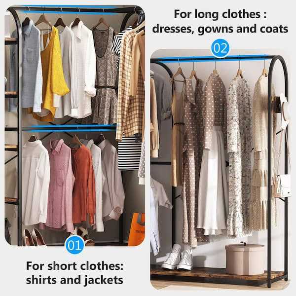 If you have large need of clothing storage, this closet organization system is just the thing for you! It features triple pipe bars for hanging clothes and coat that without taking extra time to iron out wrinkles from folds, while 2 shelves below and 5 side shelves is ideal for staking shoes and accessories. Use this corner closet system to bring organizational appeal to your wardrobe rather than sorting through an overstuffed closet. Color: Rustic Brown and Black.