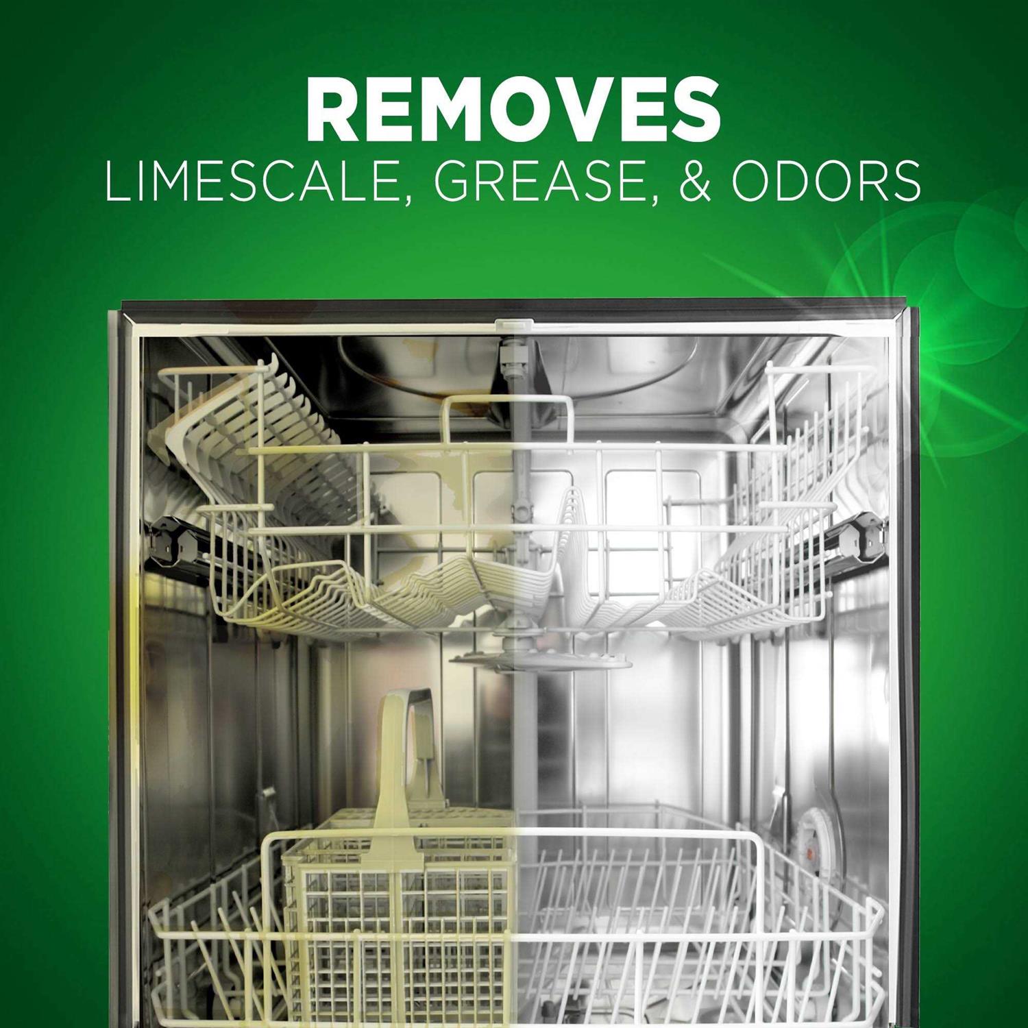 - Removes lime scale buildup, grease, and odors from your dishwasher