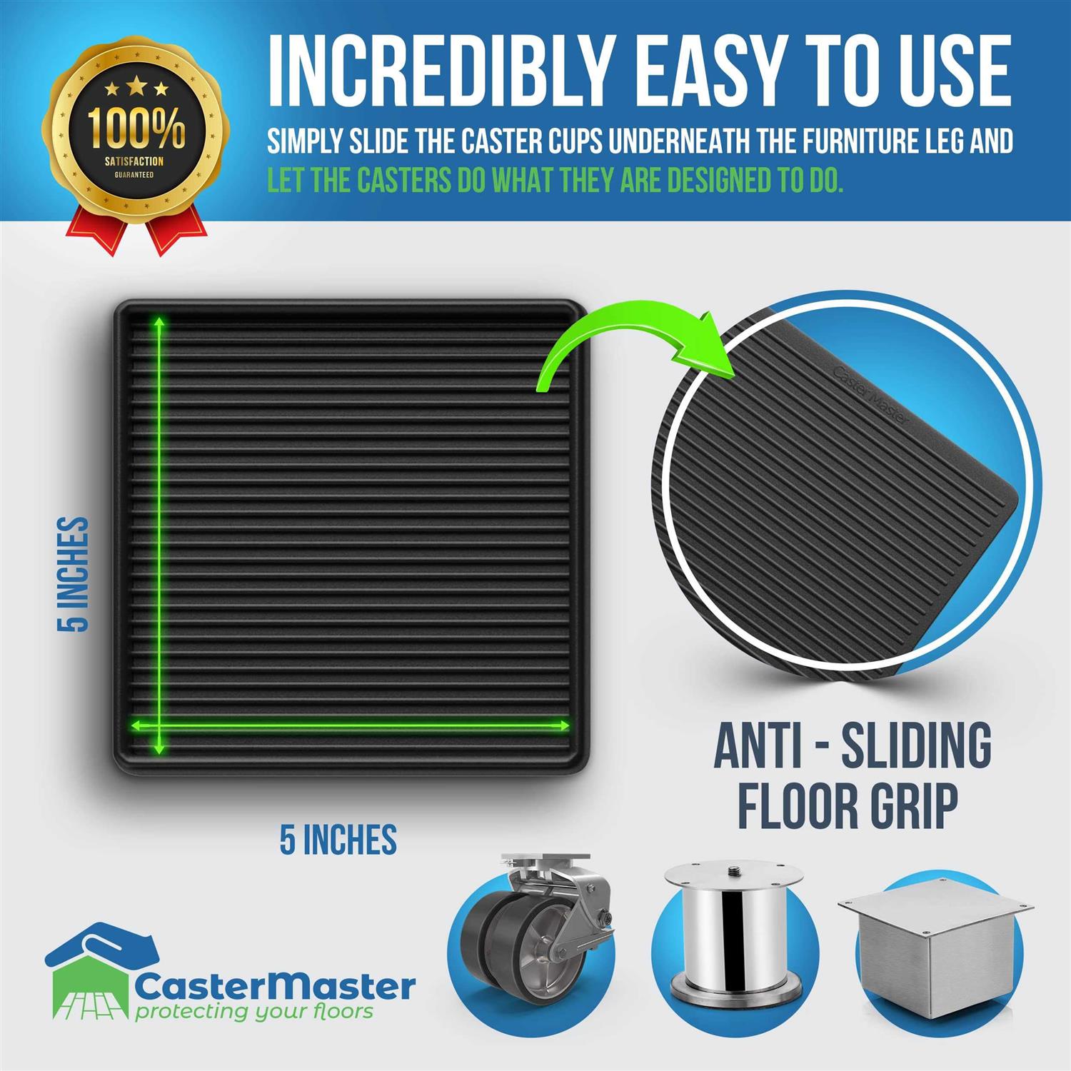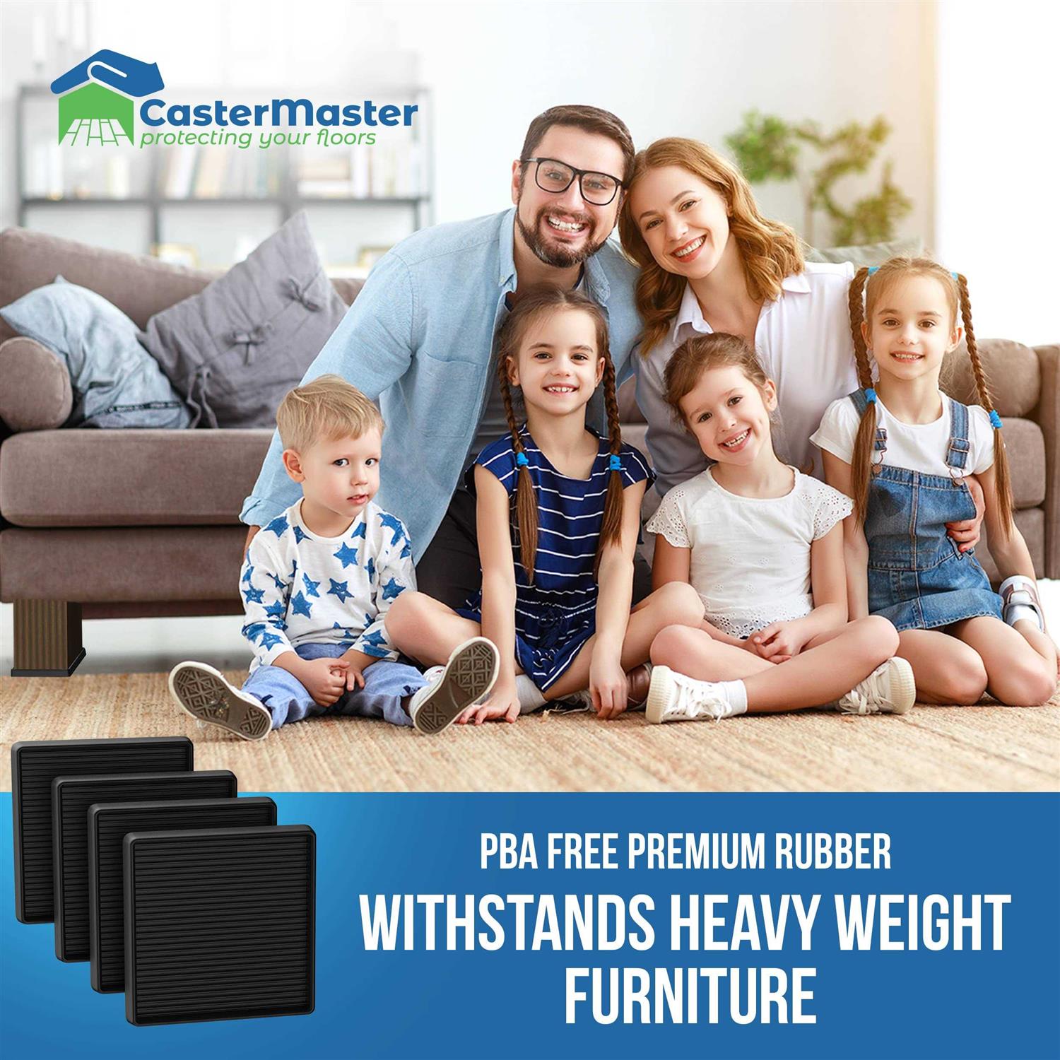 STOPS YOUR FURNITURE FROM MOVING. Are you tired of your furniture moving when you sit down or stand up Unlike other brands, CasterMaster caster cups are made with anti-slip flexible rubber that is designed with small rubber ribs to grip your floor and hold your furniture in place! No more sliding around with these specially designed rubber furniture stoppers! They are also a great support for upright and grand pianos, outdoor BBQs and outdoor furniture. PROTECTS ALL FLOORING. CasterMaster caster cups protect ALL flooring types! This includes but is not limited to hardwood, linoleum, vinyl, carpet, ceramic tile, & cement floors. No more scratches, indentations, or marks on your floors from your home and bedroom furniture with the use of these rubber furniture cups. SMALL FAMILY BUSINESS. When you support our family by purchasing from CasterMaster, you are also helping victims of human trafficking. COMES IN MULTIPLE SIZES! This measurement is the inside of the cup and will hold furniture up to the stated inch size. For the best success, measure your furniture feet and order the CasterMaster cups closest to size to your furniture feet. Make sure to order the correct size so your furniture will not move within the cup itself. CasterMaster Round Rubber Furniture Caster Cups is not like the simple bed risers, floor protectors for hardwood floors, or furniture pads for hardwood floors and other types of floors. It is designed to offer special anti skid on wooden floors, casters or other wheel types. furniture sliders, furniture sliders for carpet, furniture sliders for hardwood floors make furnitures slip but this caster cups keeps furnitures firm and in place. It is the ultimate gripper for beds, sofa, that keep couch cushions from sliding, piano, bed bed stoppers to prevent sliding or skidding. Stop using the regular rubber furniture pads, rubber furniture pads non slip, rubber pads for furniture legs non slip, bed risers etc, use Caster Master Caster cups made with high quality material, they are solid, long lasting and do not wear off. Also support this by helping victims of human trafficking. A durable chair leg protectors for hardwood floors will make a difference in your chairs, keep couch from sliding and serves as carpet protectors for furniture legs. These are definitely the best anti slip furniture pads you will ever use.