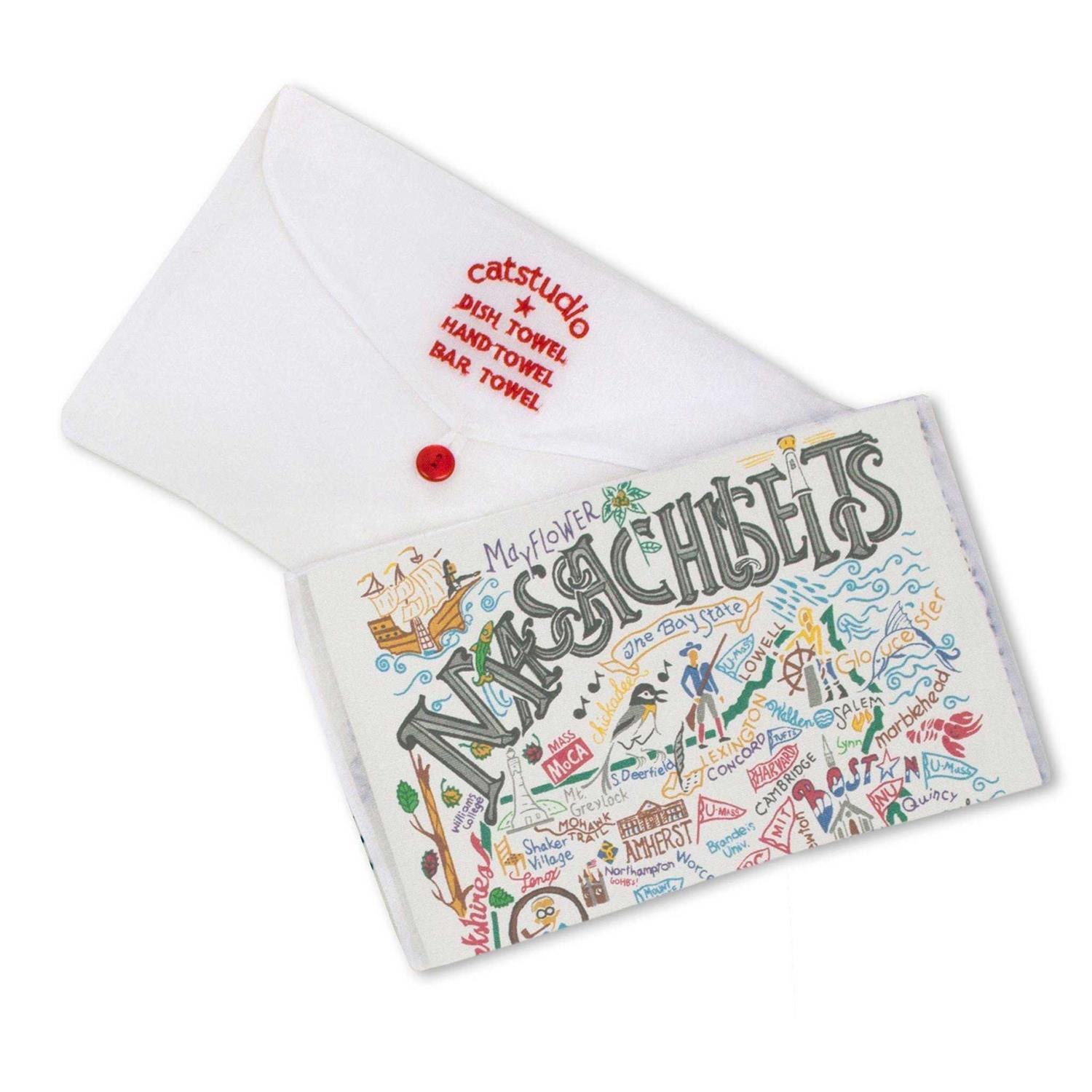 The design is silk-screened, then framed with a hand embroidered border on a 100% cotton dish towel. Three stripes down both sides and hand dyed rick-rack at the top and bottom add a charming vintage touch. Delightfully presented in a fab organdy re-usable pouch! Dish towel measures 20″ x 29″ Made in India May also be used as a hand towel, guest towel, or bar towel! Machine wash cold and line dry. CatStudio’s original geography collection encompasses all 50 states, plus many cities, regions, resorts, national parks, and countries. Their designs embrace a love of travel and discovery with a twist of humor, nostalgia, and hand-craftsmanship. 160 original designs and counting; celebrated on hand-embroidered pillows, dish towels, glasses, and more.