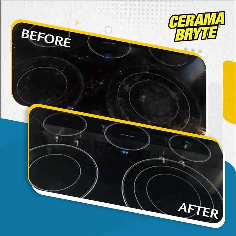 This heavy-duty, non-abrasive cooktop cleaner removes grease, grime, and stains on all smooth cooktop / stovetop ranges, including glass, ceramic, induction, radiant, convection, and halogen without scratching and maintains shine Just apply a quarter-sized amount directly to cool cooktop, rub with the included cleaning pad or a dry paper towel, buff surface and wipe clean; for burnt on food use single-edge razor blade Cerama Bryte scraper tool This household essential kitchen cleaner is recommended for GE, Electrolux, Amana, Frigidaire, Whirlpool, Hotpoint, Kenmore, Admiral, Maytag, Tappan, Viking and any other smooth cook top or stove top The Cerama Bryte Cooktop Cleaning Kit 6 Piece includes: 10 oz Cooktop Cleaner, POW-R Grip Pad Tool, Scraper, and 3 Cleaning Pads perfect for daily cooktop cleaning Cerama Bryte Cooktop Cleaner contains no phosphates, dimethicone, or silicone and is Made in the USA Cerama Bryte Cooktop Cleaner is safe for use on ALL smooth top ranges including radiant and halogen. Formulated for heavy-duty cleaning without scratching, Cerama Bryte is the choice for removing tough stains while regular use helps maintain shine and performance. The formula does not contain silicone, plastic beads, dimethicone or other substances that could harm the cooktop surface. Cerama Bryte has been tested and qualified for CERAN by SCHOTT, the maker of the glass cooktop portion of all ranges. Perfect for both daily cleaning and removing tough stains, it maintains the shine and performance of glass, glass-ceramic or ceramic cooktop surfaces. Boiled over pasta, spilled soup and other cooking stains are no match for the no-scratch, mild abrasive formula of Cerama Bryte. Cerama Bryte can be used on GE, Electrolux, Amana, Frigidaire, Whirlpool, Hotpoint, Kenmore, Admiral, Maytag, Tappan, Viking, and any other smooth cooktop or stovetop. TO USE: Remove any burnt-on food with a single-edge razor blade Cerama Bryte Scraper. SHAKE WELL. Apply a quarter-sized amount directly to cool cooktop. Rub with a dry paper towel or a Cerama Bryte Cleaning Pad. Buff Surface with a soft cloth or paper towel. Close cap after use.
