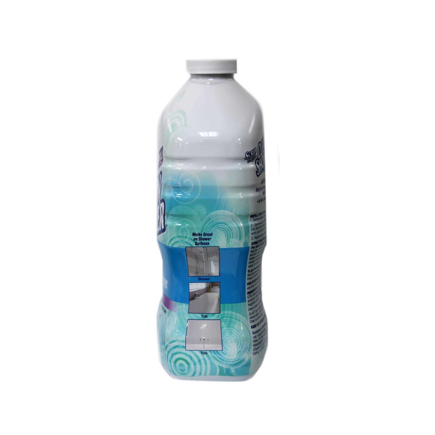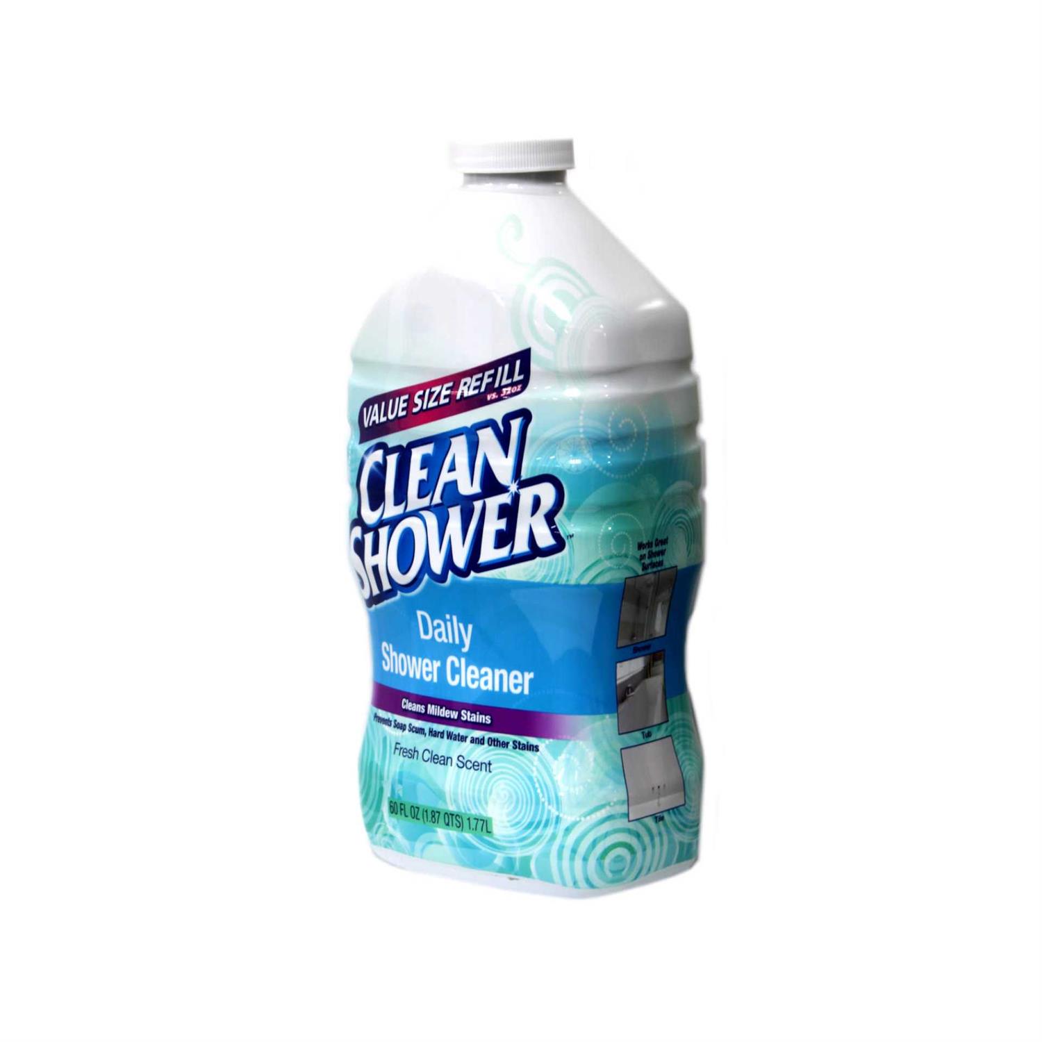 Keep your tub and shower spotless without all the work with Clean Shower Daily Shower Cleaner Refill, 60 fl oz. This powerful cleaner prevents soap scum, hard water build-up and mildew stains from forming, with a mild formula that’s never tough on surfaces. Clean Shower’s crafted without bleach or ammonia-free formula, without harsh abrasives that can scratch porcelain, glass, chrome or ceramic materials. The cleaner goes to work on contact, eliminating the need for scrubbing. Daily shower spray refills make it easy to keep your bathroom clean. To use, simply pour contents of the refill container into the original Clean Shower Daily Shower bottle and replace trigger sprayer. Just spray and walk away while it cleans for you. For best results, apply the solution onto all wet surfaces, such as tile, curtains, glass doors and tub surfaces.