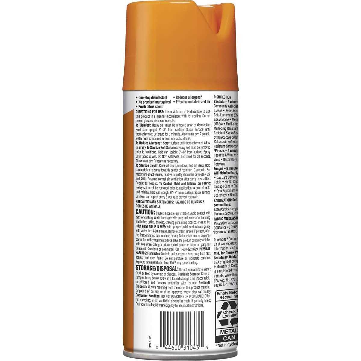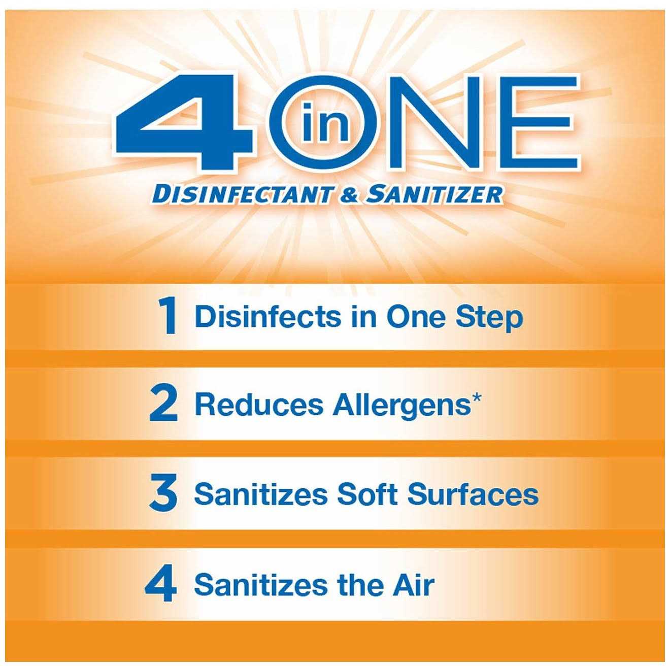 Hand Sanitizers by CloroxPro. Details:Clorox 4-in-1 Disinfectant and Sanitizer lets you disinfect, sanitize and reduce allergens with a single all-purpose aerosol spray without the need to preclean. This powerful cleaner disinfects hard surfaces with 24 EPA-registered kill claims, and sanitizes soft surfaces in as little as 30 seconds. It even kills odor-causing bacteria in the air, and leaves behind a refreshing citrus scent. Clorox 4 in One reduces pet dander, dust mite matter and cockroach matter allergens that can trigger allergies and asthma. It is ideal for offices, daycare centers, schools, hotels, restaurants and other commercial facilities.