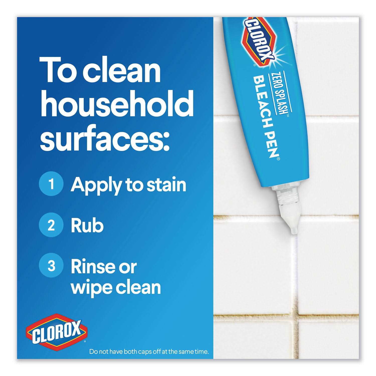 Clorox Zero Splash Bleach Pen dispenses bleach where you need it without a splash. The bleach pen is dual-tipped with a fine point and a broad scrubber to let you remove stains with precision and control with the power of Clorox bleach. It works on household surfaces and laundry so that you can write off stains for good, wherever they are. The dual-tipped applicator has a fine point for targeted bleaching and a scrub brush to apply and rub bleach onto larger areas. Convenient and easy to use, the Clorox Zero Splash Bleach Pen allows you to bleach only what you need in the laundry room and is ideal for removing mildew and mold on bathroom grout. The Zero Splash Bleach Pen is portable and works great for bleach crafts and beyond. Bleach the mess and leave the rest.