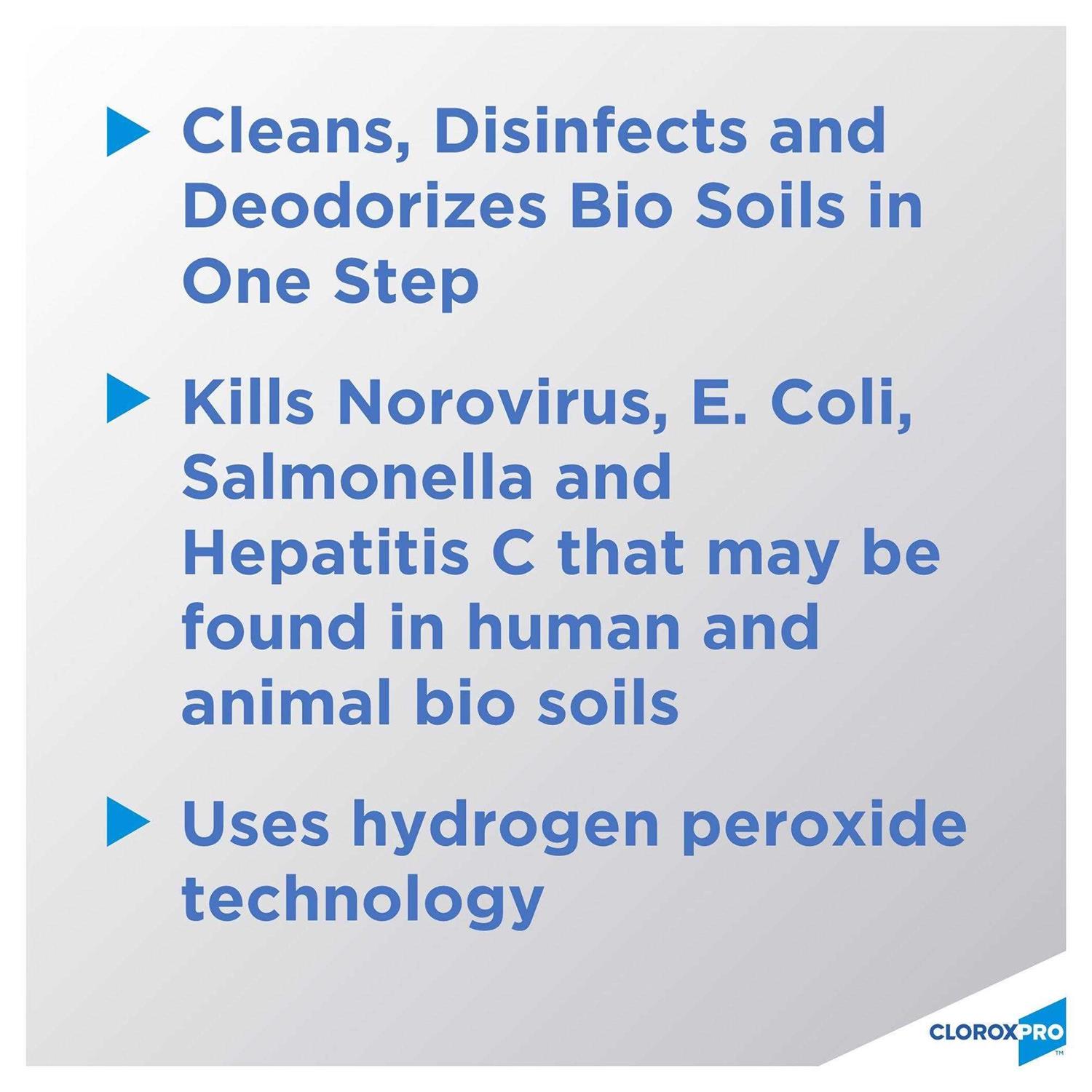 Clorox Disinfecting Bio Stain & Odor Remover is perfect for disinfecting and removing the toughest odors and stains in one step. This bleach-free stain and odor remover uses hydrogen peroxide technology to kill norovirus, E. coli, Salmonella and Hepatitis C that may be found in human and animal bio soils. Product is available in a trigger spray, pull top and gallon refill. Compliant with OSHA Bloodborne Pathogens standard, this product works great on stains from blood, feces, vomit and urine. This versatile disinfectant can be used to clean a variety of hard and soft surfaces. With Smart Tube Technology, you are guaranteed to spray every drop.