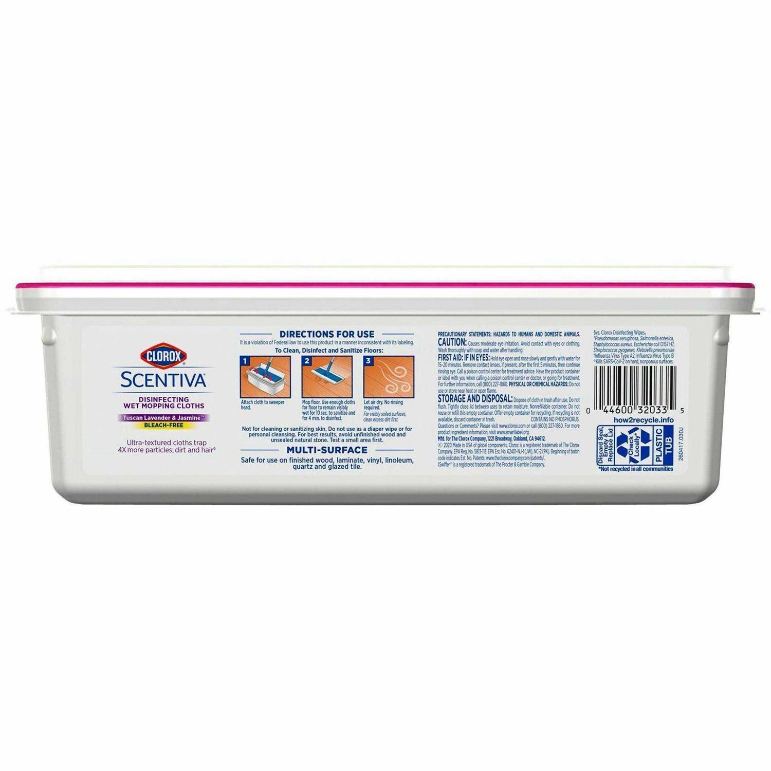 Clorox Scentiva Disinfecting Wet Mopping Cloths are ultra-textured and pre-saturated to trap 4X more particles, dirt and hair as the delicate scent of Tuscan Lavender & Jasmine lingers in the air. These bleach-free wet mopping cloths disinfect and kill 99.9% of viruses and bacteria with the trusted Clorox clean. Calming lavender and soothing jasmine take floor cleaning to a whole new level as the Scentiva scent freshens your home without any harsh chemical smells while the cleaning formula addresses your cleaning challenges. This refill pack of disinfecting wet mopping cloths is safe for use on multi-surfaces including finished wood, laminate, vinyl, linoleum, quartz and glazed tile. To clean, disinfect and sanitize floors, simply attach the cloth to a sweeper head. Mop floor and allow to air dry. No rinsing is required. These wet mopping pads are designed to fit Swiffer sweeper mop heads. Clorox Scentiva Disinfecting Wet Mopping Cloths cleans like Clorox, smells like paradise.