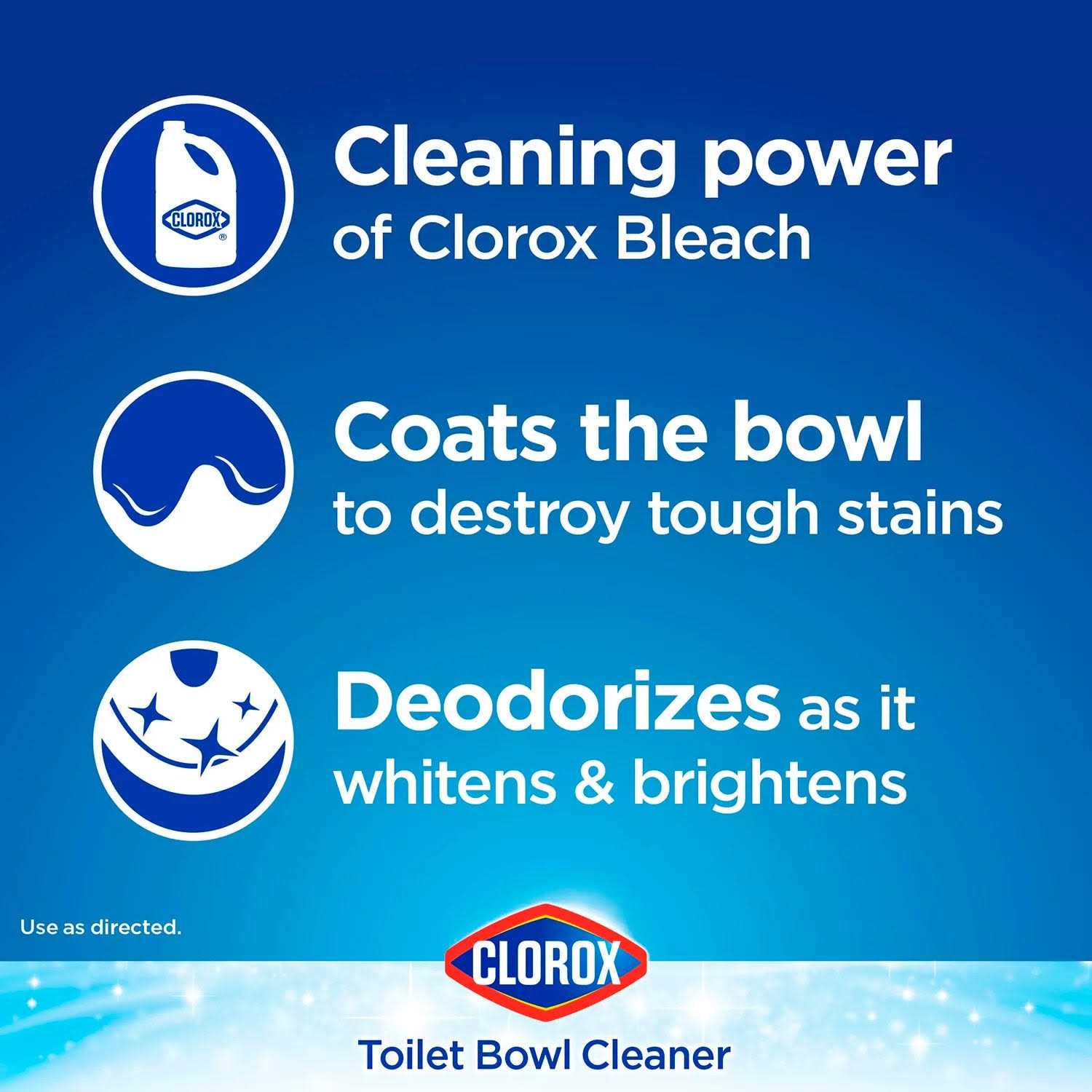 Clorox Toilet Bowl Cleaner provides a deep clean and kills 99.9% of germs, removes stains and leaves toilets sparkling with a Rain Scent. Its unique wide dispensing nozzle delivers that cleaning power under the bowl rim. Clorox Toilet Bowl Cleaner with Bleach cleans, sanitizes and disinfects your toilet bowl with a non-abrasive formula that will not scratch surfaces and is safe to use in septic systems. The Fresh Scent also deodorizes your toilet bowl. Get better bowl coverage and sparkling toilets with Clorox Toilet Bowl Cleaner.