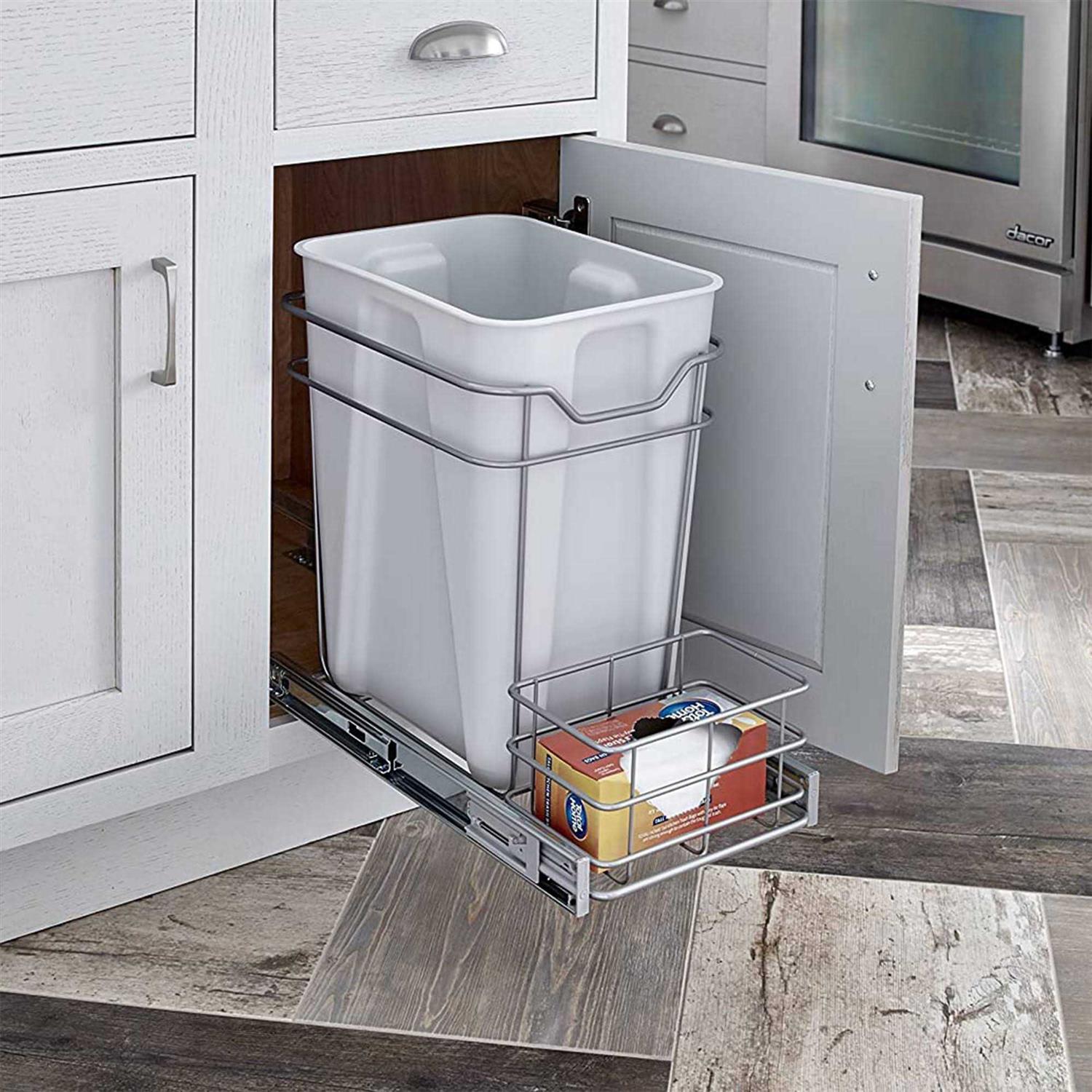 ClosetMaid This premium Pull Out Trash Can offers versatile and easy solutions in your home! This platinum-finish trash can pull-out shelf features soft-close, full-extension glides. This kitchen trash can pull-out will keep your kitchen always looking sharp and organized with the attached wire basket to store trash bags.