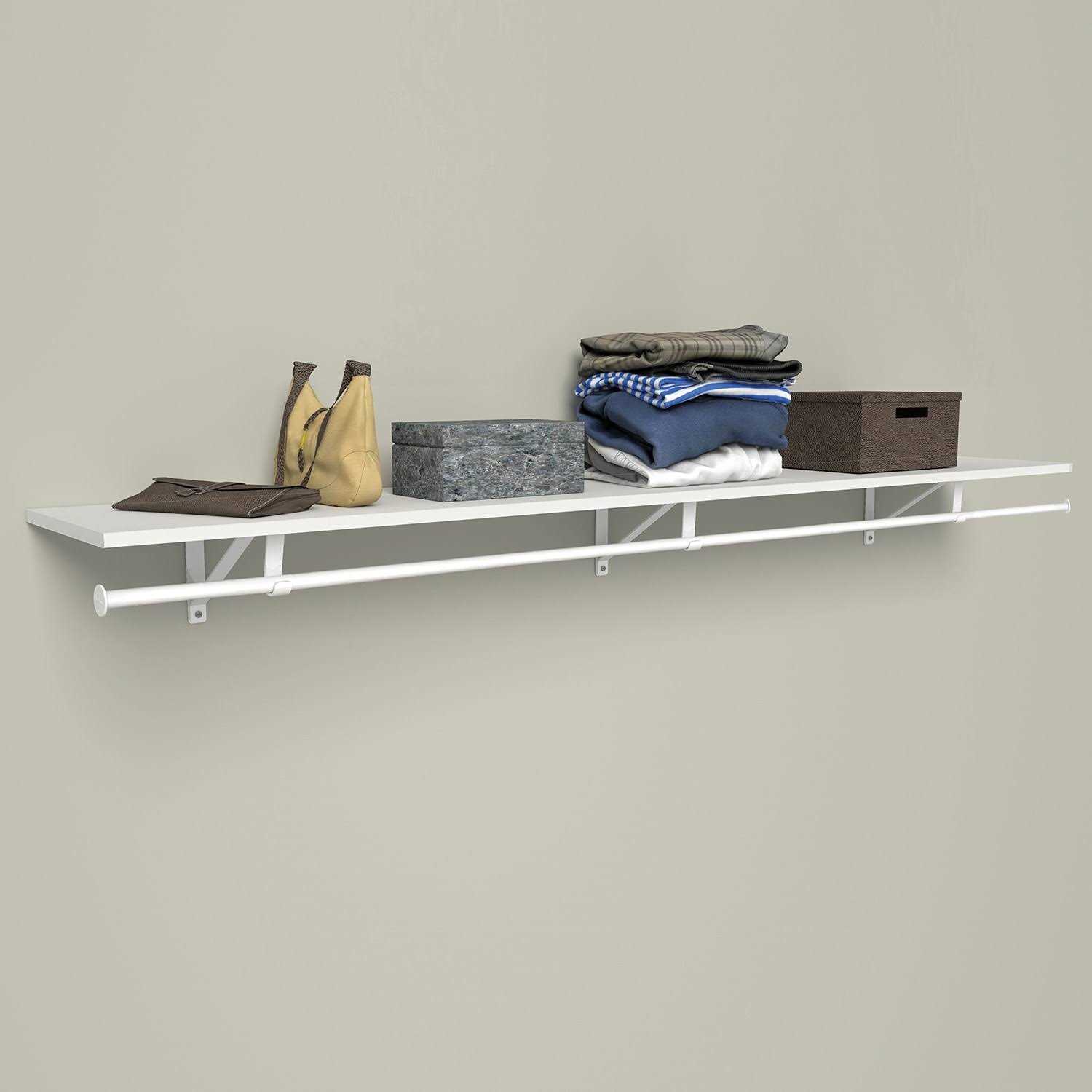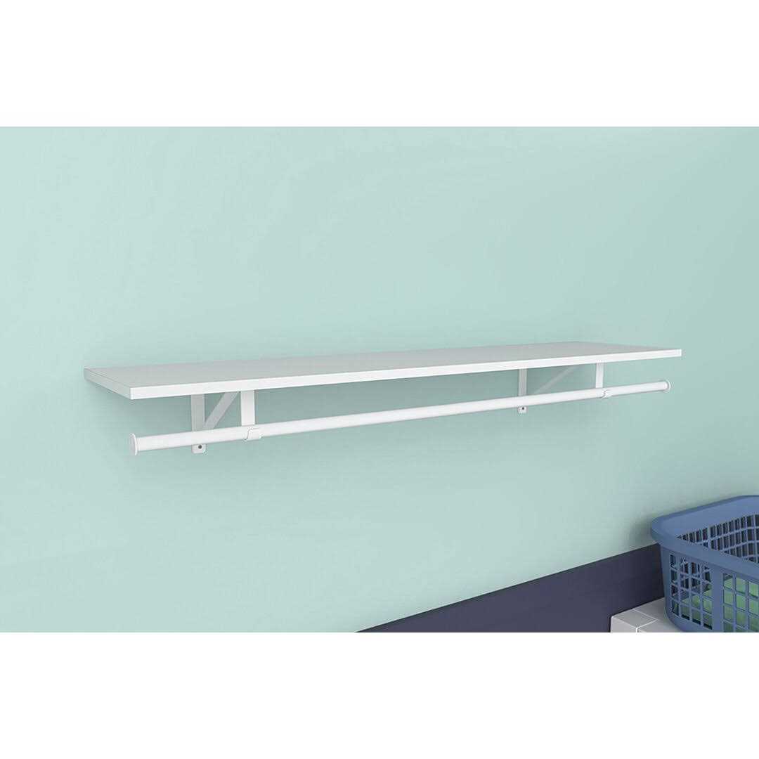 The ClosetMaid Wood Shelf Kit with Hanging Rod is ideal for the laundry room. Use the 5/8-inch thick wood laminate shelf for detergent and dryer sheets. The hanging rod provides a place to put clothing that needs to air dry. The epoxy-coated steel brackets hanging rod and hardware are included and ready to install. ClosetMaid Founded in 1965 in Delray Beach Florida ClosetMaid was the first company to manufacture ventilated wire shelving for closets. By being the first on the scene and offering such incredible quality ClosetMaid grew in size and by 1970 had moved to a new facility in Ocala Florida where they continued to thrive and establish themselves as the worldwide leader in home storage. However it didn’t take long to turn their eye for efficiency toward other aspects of the home with a fine selection of innovative wire and laminate/wood storage systems designed for the kitchen family room laundry room garage and more.