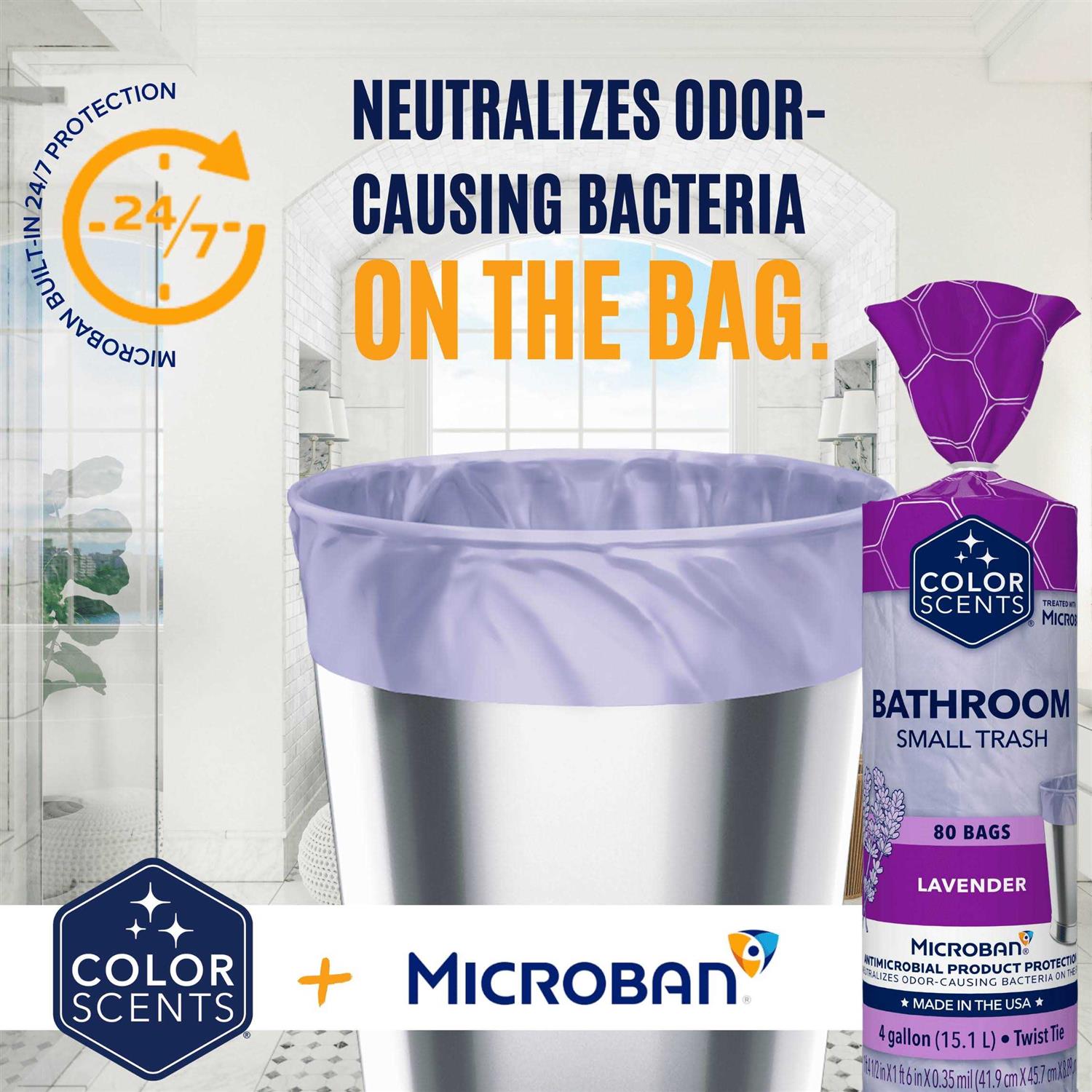 Color Scents 4-Gallon Small Twist Tie Trash Bags are perfectly sized to handle life’s small messes. For use in the bathroom, bedroom, or any room around the house where a small bin is used. Our Lavender scent is delicate and delivers subtle bursts of fragrance to help maintain an inviting smell while combating unwanted odors. As a bonus, Color Scents is now enhanced with Microban for an added layer of protection against the growth of bacteria on the bag. Add in a pop of color with our home decor complementing colors and voila, your house is a home!