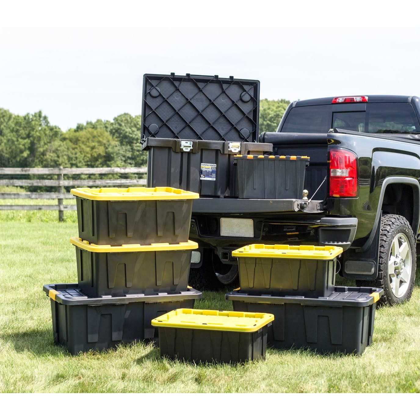 The 40-Gallon Commander by Project Source Heavy Duty stackable storage tote is designed to handle your tough storage and organization needs whether it’s on the jobsite or around the house. A thick wall design paired with a durable polypropylene (plastic) material gives you peace of mind and keeps your valuables safe. The recessed lid allows you to securely stack multiple units without fear of tipping while maximizing vertical storage space. The easy open and close dual-snap lid keeps your items securely inside the storage tote without the lid coming off. For additional security, holes around the outer rim enable the use of zip-ties and padlocks to keep your items safe on the jobsite, or from children and pets. Safely transport your totes by running tie down straps through the holes around the rim to keep the tote from moving on the road. The popular black tote with yellow lid stands out nicely on a construction site. This 40-Gallon Commander by Project Source X-large tote is ideal for bulky items such as seasonal decorations, hardware, camping gear, and more.