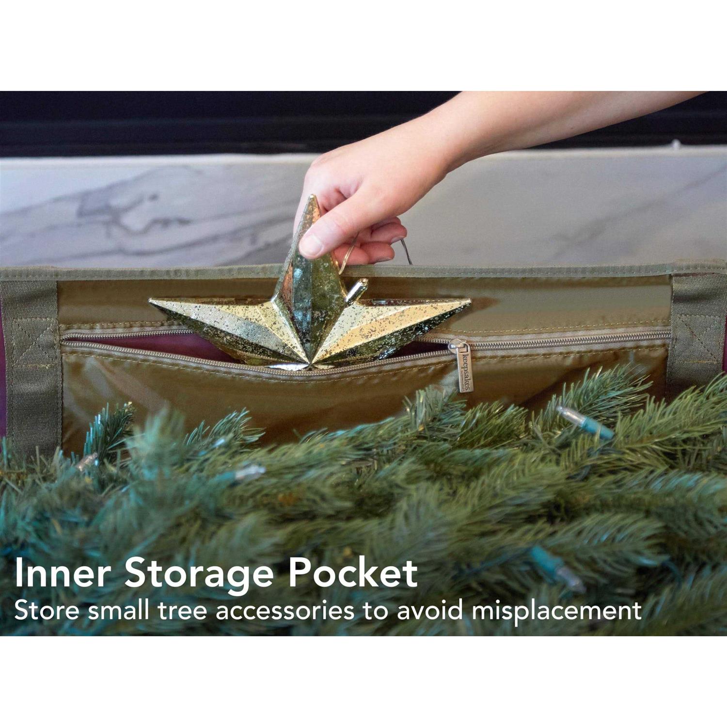 DURABLE FEATURES Three wheels for trouble-free transport with a sturdy bottom panel for support. Padded handles for carrying, exterior cinch strap to secure tree, inside pocket, rubber ID window for efficient labeling, dual zipper pulls for quick access. TOUGH MATERIAL Made with moisture resistant heavy duty 600D polyester in a tight weave design. Constructed to withstand the wear and tear from angular edges of Christmas tree branches.