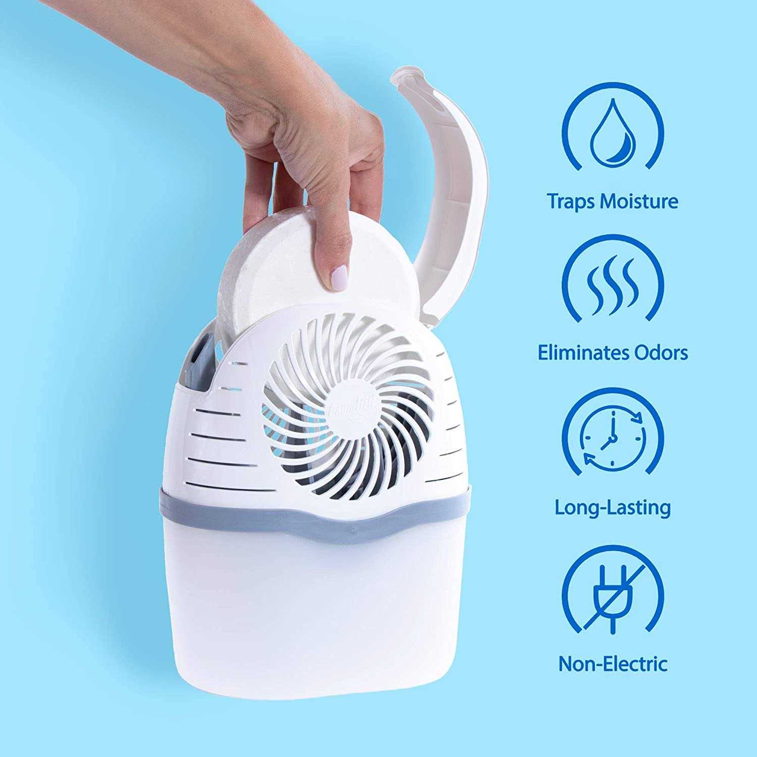 Dehumidifiers by DampRid. Details:DampRid Reusable Moisture Absorber with Drop-In Tab attracts and traps excess moisture, eliminating musty odors. Our fastest acting moisture absorber, the 360-degree ventilation system enhances airflow to eliminate excess moisture quickly. Without using electricity, DampRid Drop-In Tablets absorb excess moisture to create and maintain optimal humidity levels wherever moisture is a problem in the home or office. To use, simply insert an unwrapped tablet into the reusable moisture collection units. When the moisture collection reservoir is full and the tablet has dissolved, pour out the liquid and insert a refill tablet (Fresh Scent and Fragrance Free refills sold separately). DampRid moisture absorbers are ideal for use in the bathroom, laundry room, closet, basement, or storage area – anywhere damp, stagnant air is a problem. Not for use in moving vehicles. Keep out of reach of children. Read and follow all label directions.