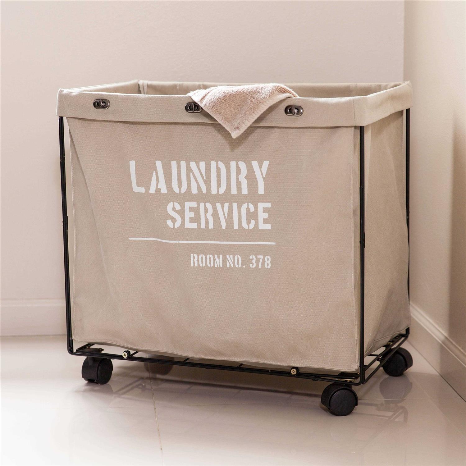 Dimensions: 23.63L x 14.25W x 22H in.. Durable canvas, iron, nickel, and plastic construction. Beige finish. Rustic army style. Frame with wheels for easy transportation. Folds flat. Make laundry time easy with the Danya B Army Canvas Laundry Hamper on Wheels. This hamper features a wheeled frame that makes it a breeze to transport heavy loads of laundry. The frame can fold flat for storage when not in use and the durable canvas hamper can be removed for cleaning. The industrial design will add a rugged edge to your home décor. Color: beige/nickel – LY207.