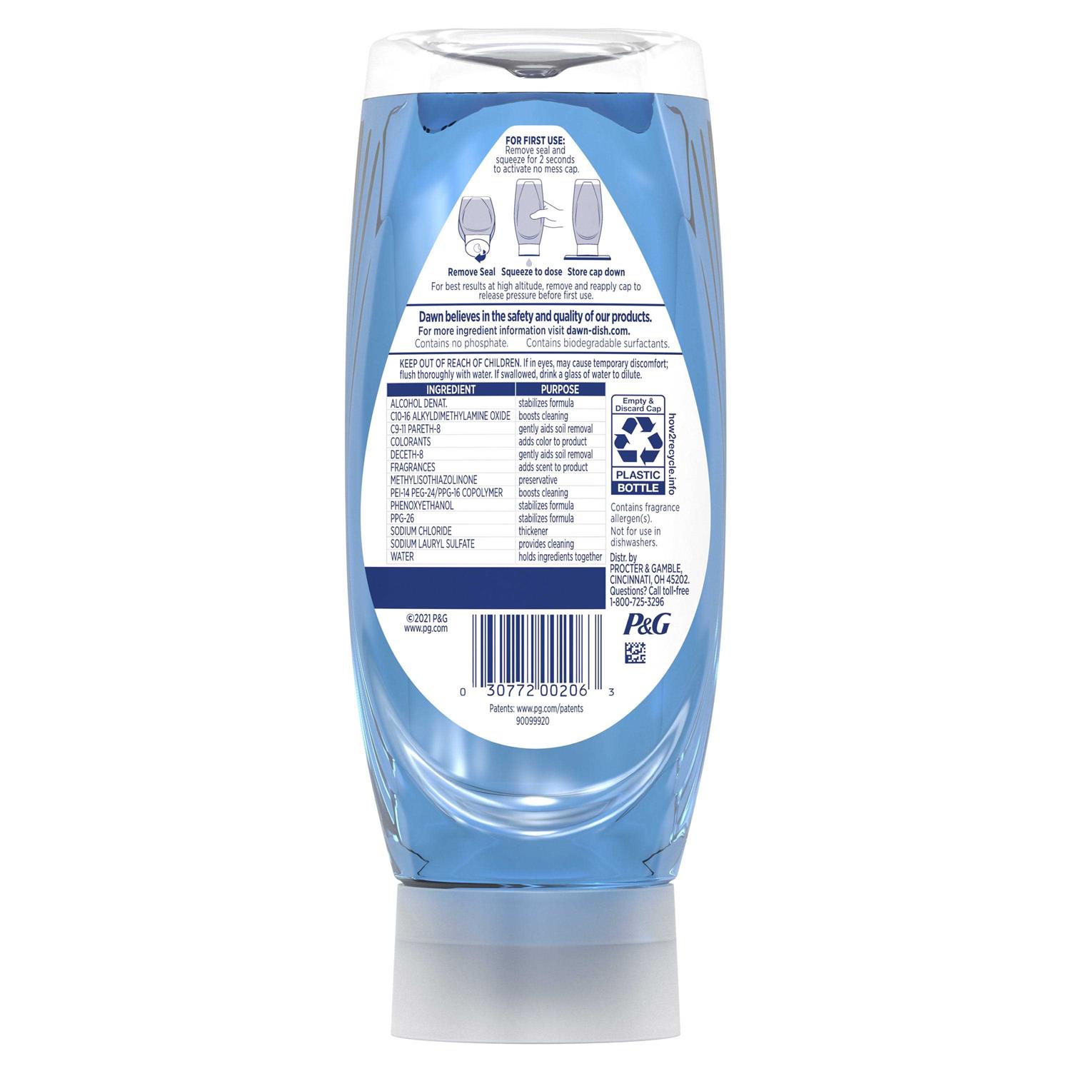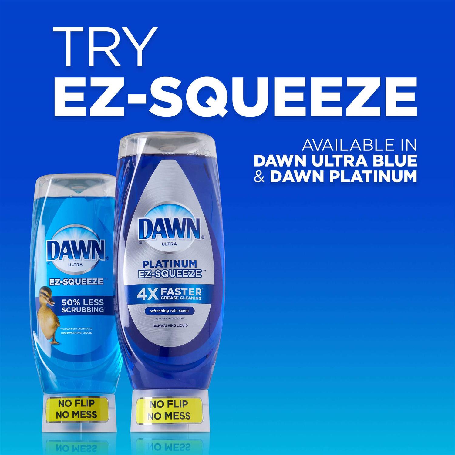 New Dawn EZ-Squeeze bottle there’s no flip and no mess. The EZ-Squeeze bottle makes dishwashing fast and easy. Plus Dawn’s powerful formula makes for the Easiest Squeeziest Tackle your greasiest clean. From the first squeeze to the last you’ll never worry about wasting a drop with Dawn’s new EZ-Squeeze bottle. No matter what you’ve got cooking in the kitchen Dawn dishwashing liquid dish soap will leave your dishes squeaky clean every time. Get your ultimate clean and be the kitchen hero with the Grease Cleaning power of Dawn dishwashing liquid dish soap. With 50% less scrubbing (vs. Dawn Non-Concentrated) Dawn dishwashing liquid dish soap works harder so you can get back to spending quality time with your family. Dawn dishwashing liquid dish soap can even be used to clean items beyond the kitchen sink. Use Dawn dishwashing liquid to remove grease and grime from external car surfaces and the outer shroud of a gas grill. Dawn dishwashing liquid dish soap is tough on grease yet gentle. It’s so gentle that Dawn dishwashing liquid helps save rescued wildlife from oil spills. Dawn dishwashing liquid dish soap is Americas 1 Dish Liquid (based on sales).