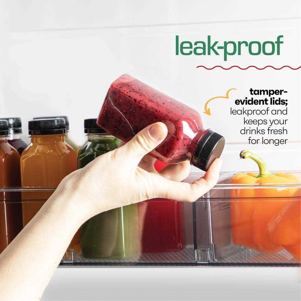 PREMIUM JUICE BOTTLES – Package includes 12 reusable juice bottles, 12 black tamper evident caps. Our bottles with caps are the perfect size for your fridge and are freezer safe Enjoy the convenience of our top-quality bottles, designed to fit seamlessly into your lifestyle LEAK PROOF – Travel with peace of mind! Our lids provide a secure tamper-evident seal that keeps your juice fresh and prevents leaks, enjoy them anywhere without worrying about spills or leaks. Carry your liquids with confidence! MADE IN THE USA – Our 8 oz reusable bottles for juicing are crafted in the USA with premium quality materials and attention to detail. These container are a great choice for those who value quality! VERSATILE – The Ideal plastic bottles with lids for homemade juices, smoothies, dressings, sauces, and more. Perfect for your home, office, school, travel, or outdoor activities. Providing a versatile and practical solution for all liquid storage needs! DURABLE QUALITY – The heavy duty, shatterproof construction of these empty juice bottles are made of BPA-free PET plastic, ensuring that they are durable and safe to use. Our juicer bottles are reusable and easy to clean remember Not dishwasher safe