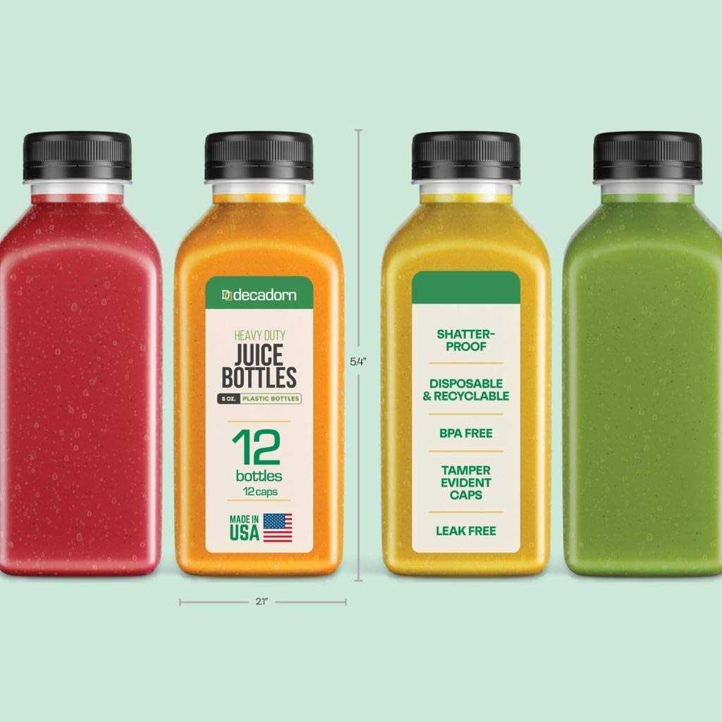 DECADORN 8oz Plastic Bottles with Caps – 12 Pack Plastic Juice Bottles for Juicing – Empty Juice Containers with Lids for Fridge – Made in USA Clear