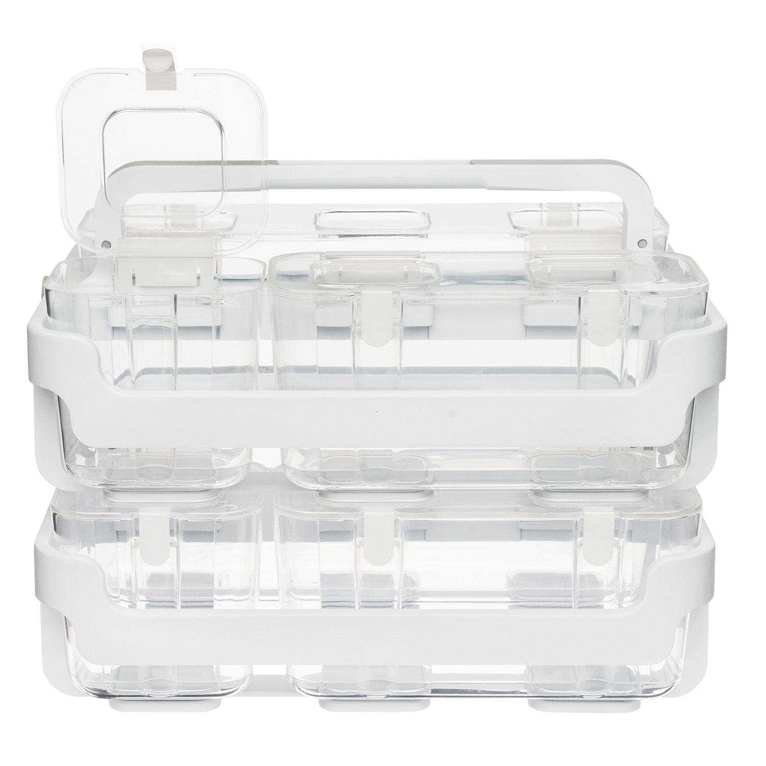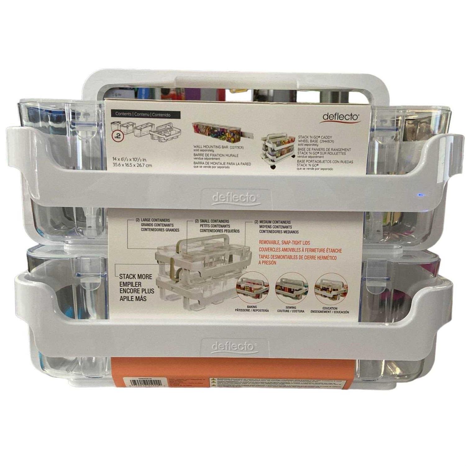 This stackable storage caddy organizer is excellent for storing, organizing and transporting personal storage and supplies. The caddy handle features unique built-in lift and lock levers. This enables easy stacking and transport. Each stackable caddy organizer includes three removable clear containers: 1 small, 1 medium, and 1 large. The clear material allows you to see items at a glance. The containers feature hinged snap-tight lids to keep items secure and are easy to remove. Use the caddy to store arts, crafts, and office supplies, as well as general household supplies.