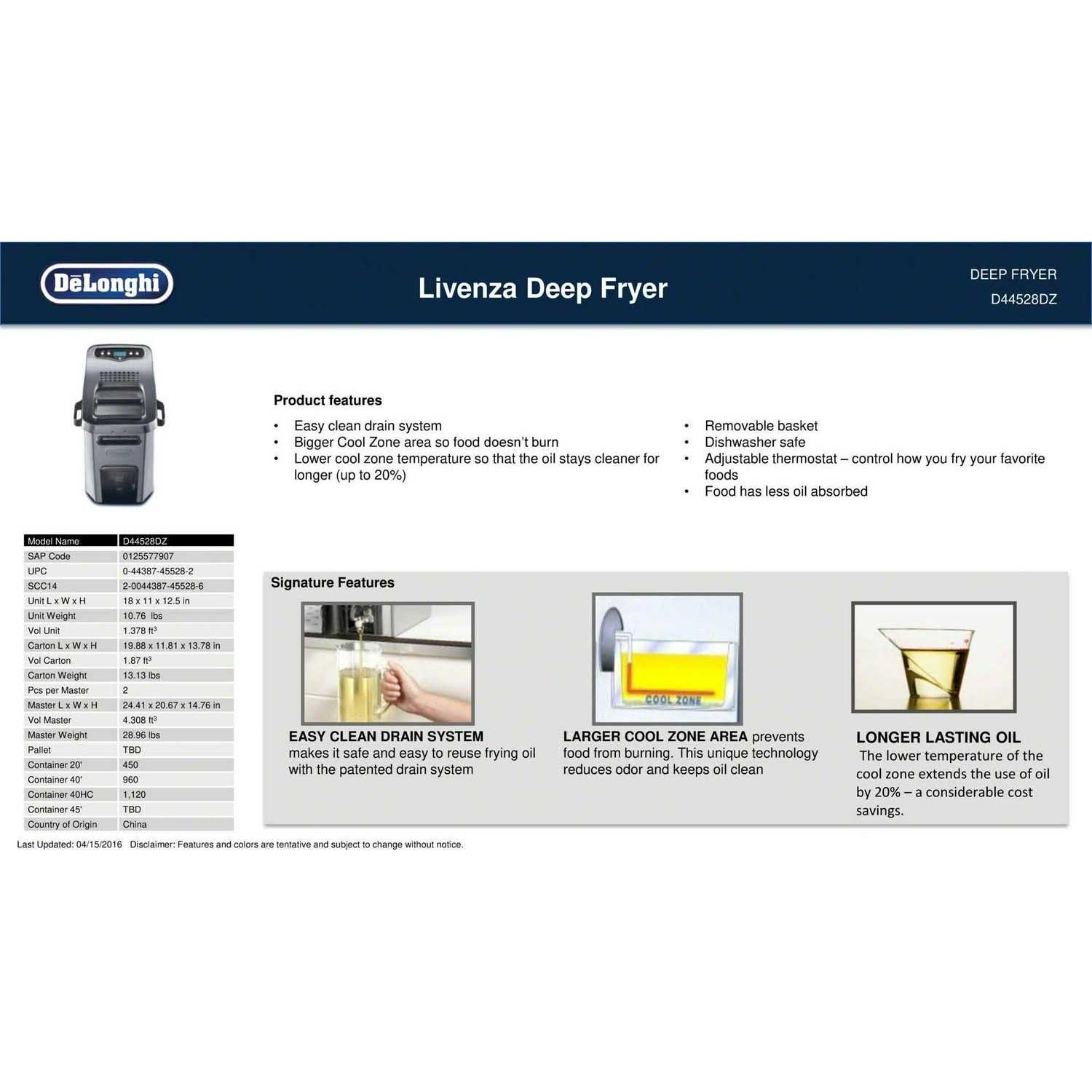 With the Livenza deep fryer it’s easy to gather your friends and family for meals and snacks. The timer allows you to accurately set and monitor cooking time for perfectly fried food. With dual-zone technology the removable heating element is in direct contact with food for fast crispy results and the cool zone located beneath the heating element prevents food particles from burning. The lower temperature of the cool zone extends the use of oil by 20% which amounts to considerable cost savings. When it is time to change the oil leftover oil is quickly and easily removed with the Easy Clean draining system. Plus dishwasher-safe parts allow you to enjoy stress-free cleanup. Whether it’s the enticing aroma of crispy French fries or the mouthwatering fragrance of homemade donuts every indulgent treat you prepare will be delicious. And with its large capacity be prepared for lots of company!