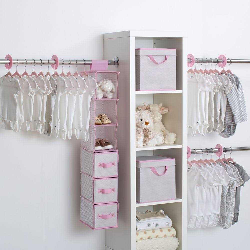 WHAT’S INCLUDED IN THIS 48-PIECE SET: 30 slim flocked velvet hangers, 12 closest dividers that allow you to divide clothes by size or color, 3 small printed bins, 2 large printed bins with lids, 1 six-shelf hanging organizer EVERYTHING YOU NEED: this handy storage set provides everything you need to organize baby clothes, burp cloths, bibs, socks, diapers, toiletries, and other nursery accessories IDEAL SIZE: The hangers are the perfect size for infant and toddler clothing EASY TO CLEAN: Spot clean bins & hanging organizer with mild soap and water DIMENSIONS: Hanging organizer: 6″L x 10″D x 39.37″H; Three storage bins: 6″L x 10″D x 6.5″H; Two storage bins with lids: 10″L x 10″D x 10″H; Hangers: 11″L x 20″D x 6.7″H; Closet dividers: 3.5″D