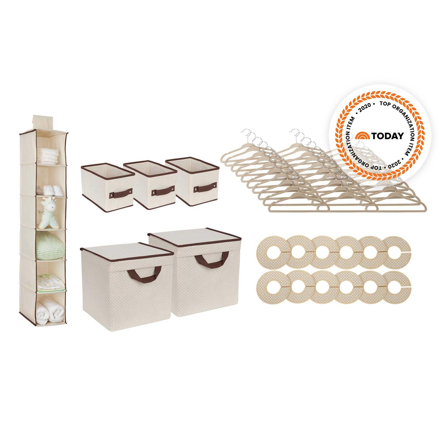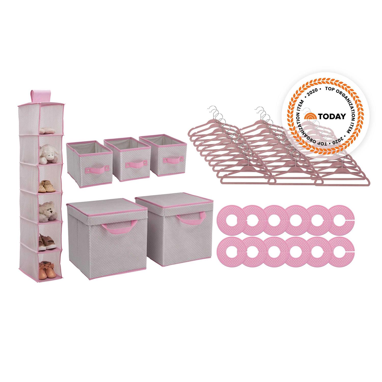 A complete closet and bedroom organization set it gives you everything you need to straighten up your child’s drawers shelves closet and dresser. This handy set includes 30 velvet hangers 12 closest dividers three small bins two large bins with lids plus a six-shelf hanging organizer. Each item is designed specifically for kid-sized stuff with a durable construction that can handle heavy use. Use the items in this set to for baby clothes burp cloths bibs socks diapers toiletries and other nursery accessories. Purchase this set for your own baby’s room or as a baby shower gift for someone else. They know there’s nothing more important than safety when it comes to your child’s space. That’s why all Delta Children products are built with long-lasting materials to ensure they stand up to years of jumping and playing. Plus they are rigorously tested to meet or exceed all industry safety standards.