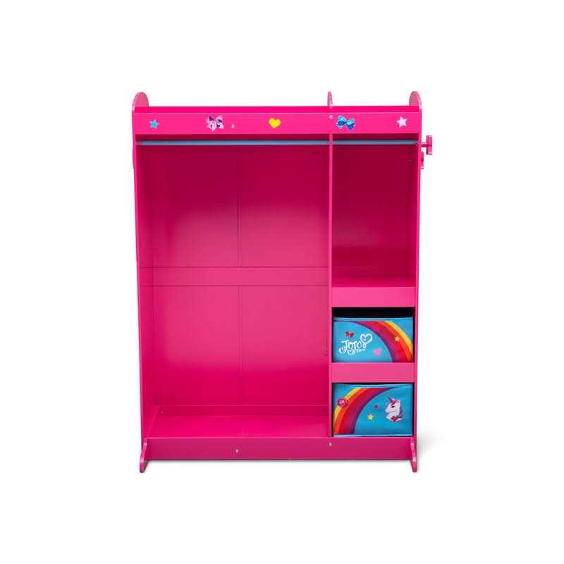 The JoJo Siwa Dress and Play Boutique by Delta Children is the prefect addition to any playroom or bedroom. This spacious unit is the perfect kid- friendly height with storage compartments for shoes, clothes and accessories. This storage wardrobe’s colorful JoJo Siwa design incorporates rainbows, unicorns and will inspire your child to dream crazy big! The interior space easily accommodates all your child’s favorite pretend play essentials—two hanging clothes bars keep outfits organized, three attached shelves with two fabric bins provide easy access to accessories and make-believe toys and a hair bow holder will store various styles and sizes of hair bows and hair clips. The raised bottom with lip is the ideal place to store shoes, bow- shaped hooks allow you to hang necklaces and a shatter-proof, heart-shaped mirror will encourage little ones to admire all their pretend play ensembles. Accessories not included. Easy to assemble. Measures: 37.8”W x 18.11”D x 47.64”H. Ages 3+ About JoJo Siwa: From her infectious spirit and can-do attitude to her love of dance, bows, and her yorkie BowBow, JoJo’s positive personality is brought to life with this vibrant collection of kids’ furniture by Delta Children. Items from this collection will inspire young girls to be themselves through JoJo’s empowering and uplifting vibes.