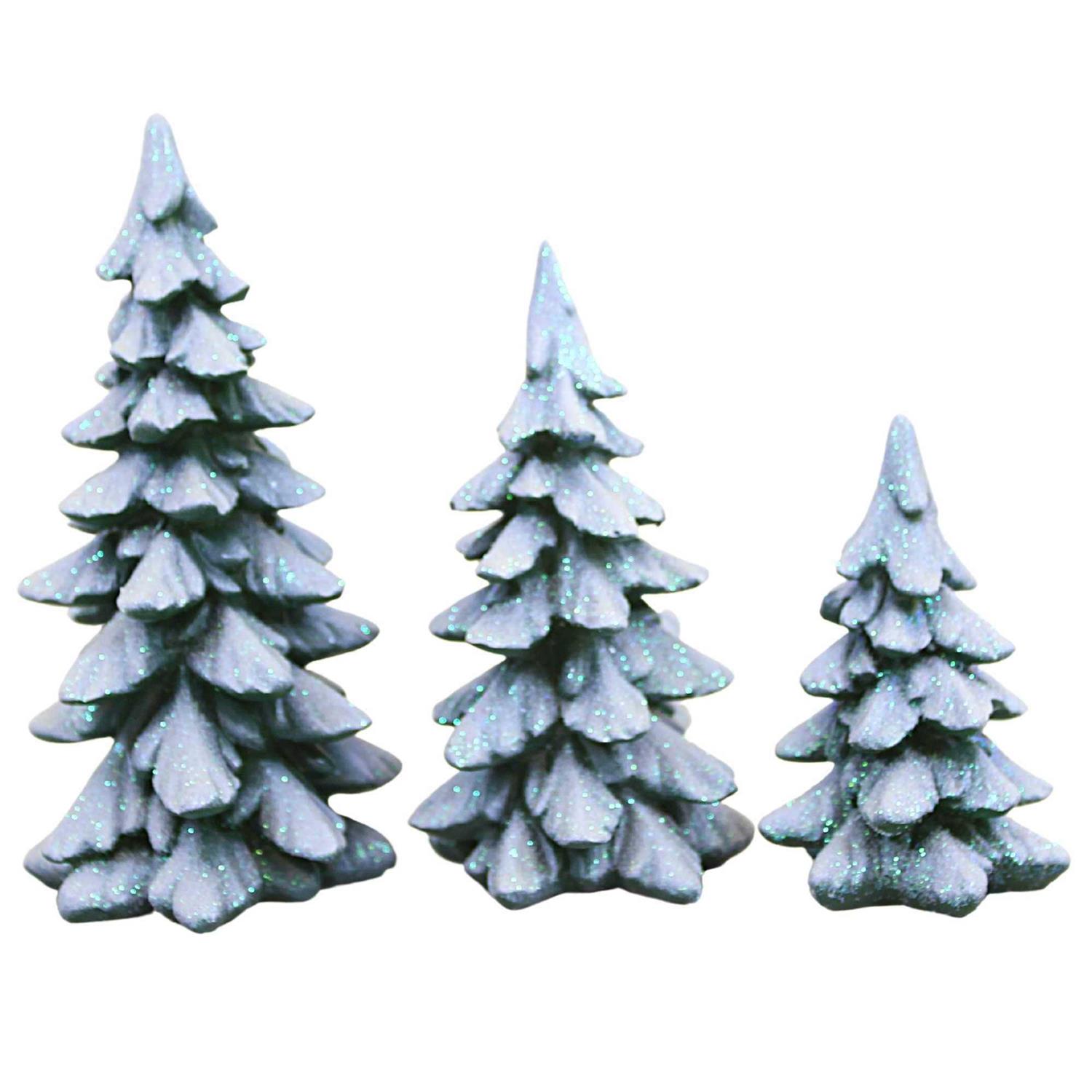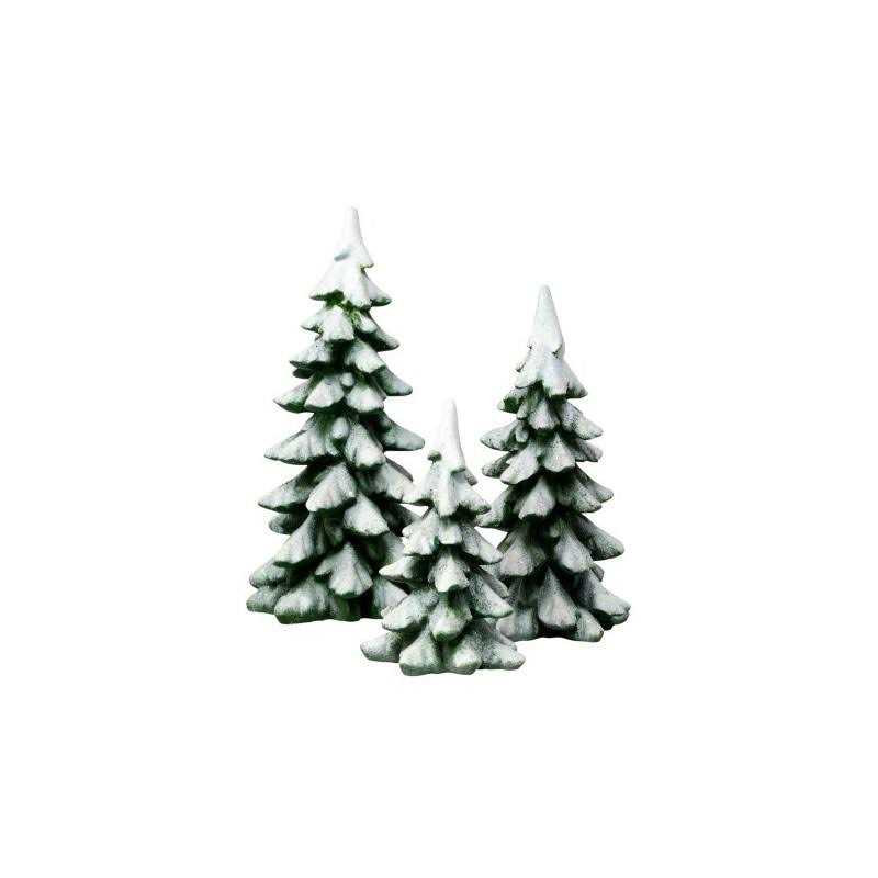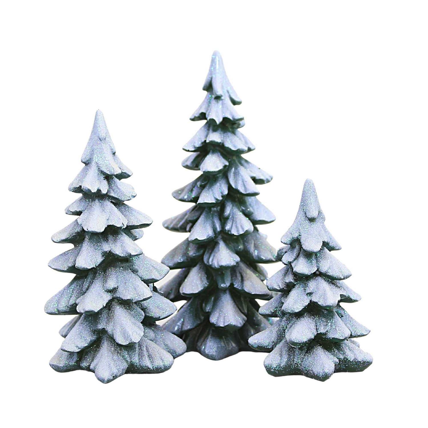 Create your very own winter forest in your Christmas village with these Winter Pines! The snow-capped branches of these holiday trees show their verdant color underneath, creating the perfect seasonal look for your woodsy display. Crafted from polyresin, these trees come in a set of three. Each tree is a different size, allowing you to get creative with your decor. The trees are covered in sparkling white snow, while the true green hue of the pine needles shines through on the underside of the branches.