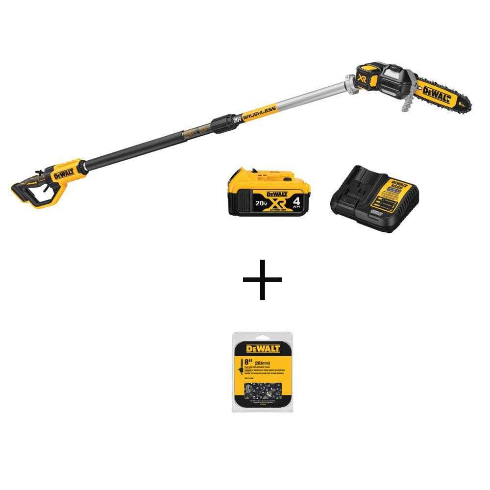 The DEWALT 20-Volt MAX XR Brushless Cordless Pole Saw comes equipped with an 8 in. Bar and Chain to handle all of your pruning needs. It features a high efficiency brushless motor that delivers up to 96 cuts per charge. The well balanced design and durable pole shaft extends up to 10 ft. for a total reach of 15 ft. It has an auto oiling feature for added convenience and time saving. It also features metal bucking strips for a durable cutting grip and a tree hook allows you to easily remove pruned branches. This durable Pole Saw Chain DWO1DT608 is designed to fit 8 in. bars on our Cordless 20-Volt MAX Pole Saw (DCPS620).