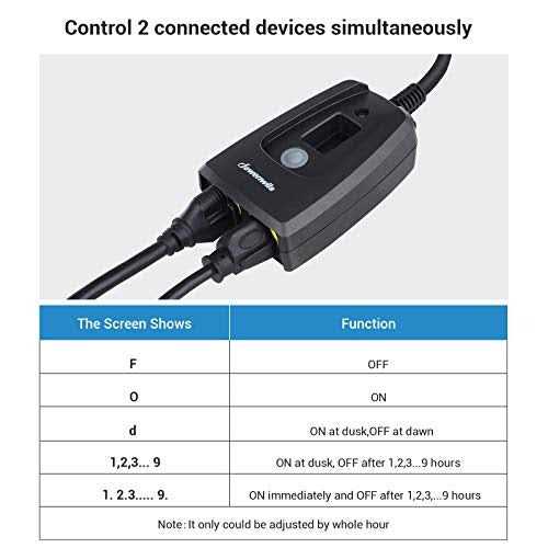 For Indoor/outdoor Use- Ul Listed, Crafted From Heavy-duty Fireproof Ppe Material, 14 Awg Sjtw Cord, Diminished Hidden Fire Dangers To Provide Superior Safety Which Is Ideal For Outdoor As Well As Indoor Use 2 Grounded Outlets- 2 Ground Outlets Can Be Controlled Simultaneously, It Can Control Christmas/holiday Lights, Outdoor String Light, And Other Garden Decorative Lights Easy To Program- Only One Button To Achieve All Programs (F=OFF/O=ON/d=ON At Dusk,off At Dawn/1,2,3… 9=ON At Dusk, Off After 1,2,3…9 Hours//1. 2.3….. 9. =ON Immediately And Off After 1,2,3,…9 Hours); It Only Could Be Adjusted By Whole Hour Multi Timer Choices – Always On/off, Countdown From 1-9 Hours, On At Dusk Off At Dawn And On At Dusk Off After 1-9 Hours, Totally Above 5 Modes For You To Choose, Once Set, It Is Daily Repeat Waterproof- Waterproof Material Allow It To Run Even On Rain Or Snowy Days; The Swivel Safety Cover On The Outlet Could Anti Dust And Water When In Use, To Make Sure No Water Splash Into The Outlets, Please Mount It In A Vertical Position And At Least 2 Ft Above Ground When In Outdoor Use