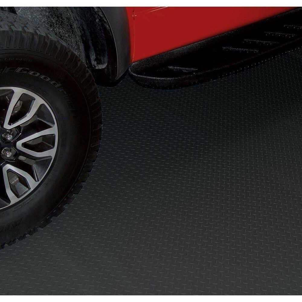 Diamond Deck roll out flooring protects your floor while giving it that stylish rugged look. Simply roll out and you’re done. Can be easily cut to any size with a utility knife or scissors. Use as a parking pad or cover the entire garage floor. Resists oil gasoline brake fluid and antifreeze. Diamond Deck is unaffected by battery acid making it the ideal golf cart mat. Great for workshops basements trailers laundry rooms mud rooms bathrooms motorhomes and camping. Perfect whether you need a temporary or a permanent flooring solution that is tough waterproof durable and easy to install. Seams can be permanently sealed together making them waterproof with our vinyl backer and Oatey X-15 Vinyl Adhesive.