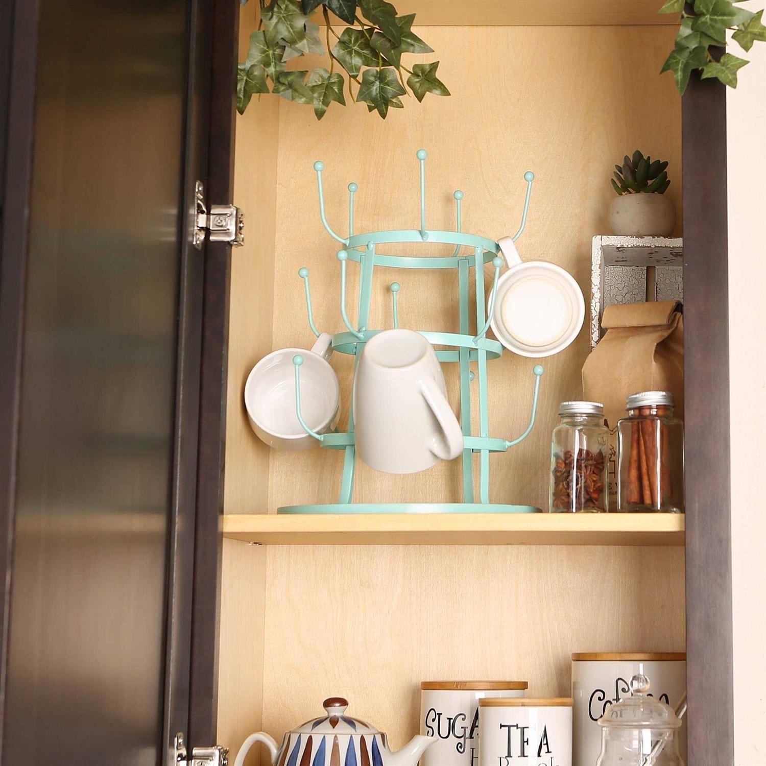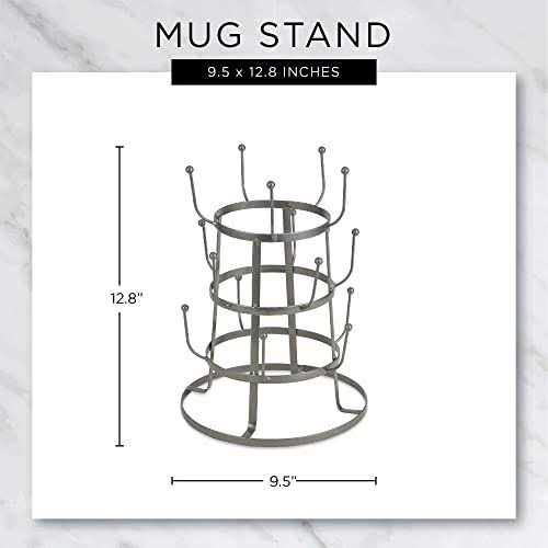 The Ridgetop 3-Tier Countertop / Pantry Distressed Vintage Metal Wire Tree Stand will organize your kitchen while adding beautiful style.Crafted of metal with an antiqued finish for a vintage look, this 3-tier mug rack will please with its stylish yet functional appearance, adding farmhouse decor to your kitchen while also providing a storage solution for mugs and glasses. Available in 3 different color options, Black, White, and Rustic Bronze, the White Mug Stand is distressed for added style. Our rustic looking wire tree stand even has a new design that ensures the cups on the bottom tier do not touch the countertop. Organize your space for a clutter-free kitchen! If you live in an apartment or have a small kitchen with limited counter space, no worries! This can display and hold up to 15 mugs! You can carefully place your hand-washed mugs on the stand to dry. Not only will this mug stand give you plenty of space to store your coffee and tea mugs, you can also keep small dessert plates stacked on top, held in place by the metal arms. Free up counter space while adding convenience and serve guests coffee, tea, and sweet desserts.