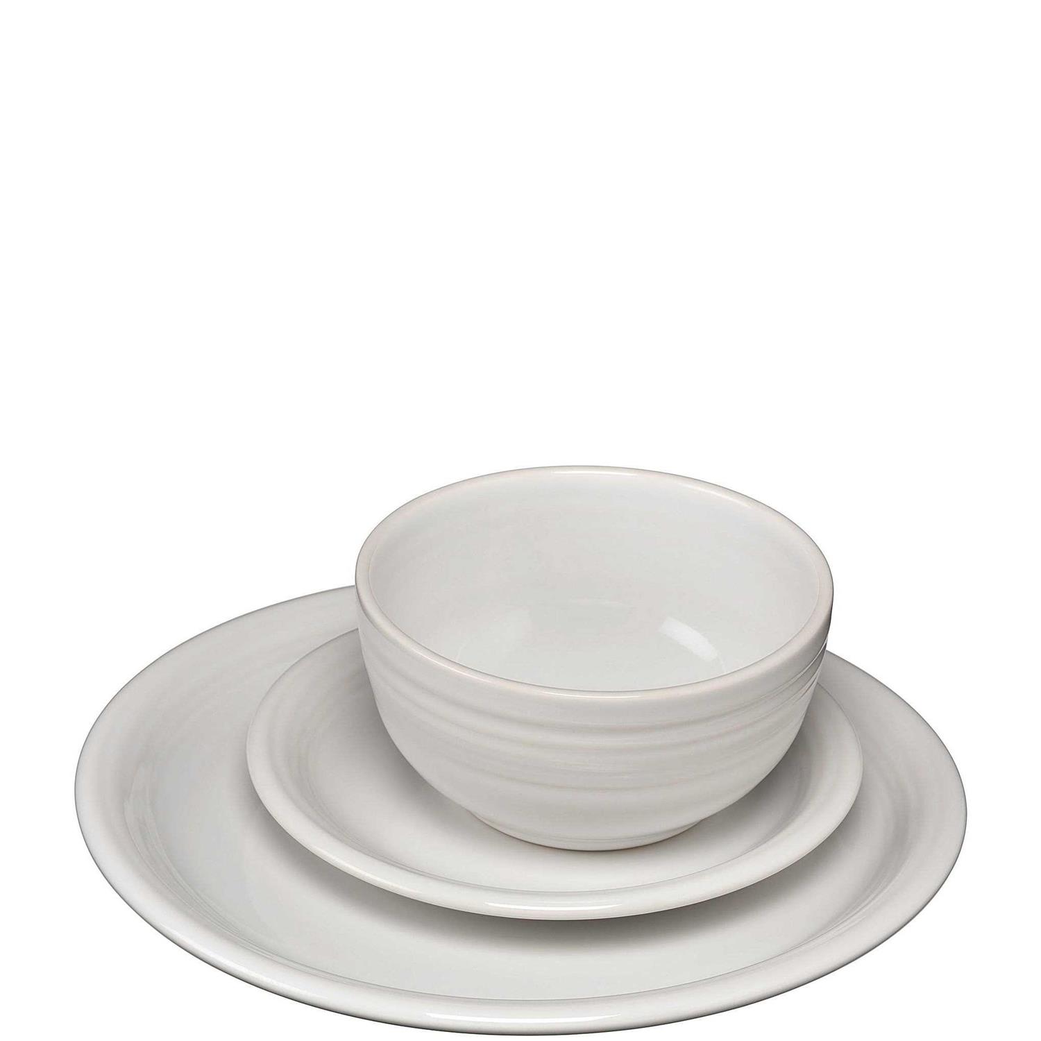 An American classic with definitive Deco flair, this set is perfect for your serve wear collection! Featuring a dinner plate, a salad plate and a bistro bowl, this set is ideal for your home. Lead-free Strong and durable ceramic Fired at a high temperature Fully vitrified to prevent cracking and water absorption Dishwasher and microwave safe Approx. 10.5 dinner plate; 7 salad; 22-oz. bistro Made in the USA.